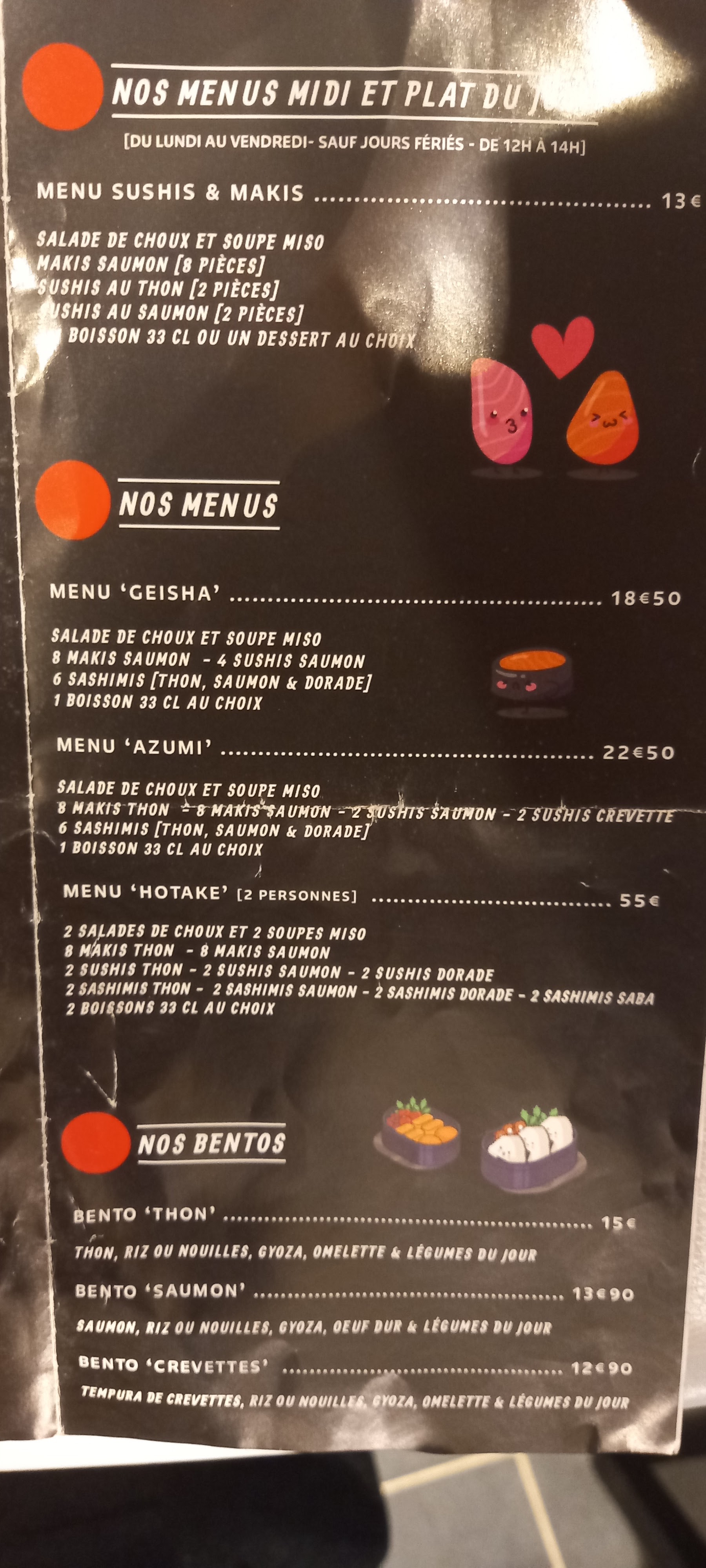 Je ne suis pas adhérent au poisson cru mais leur bento et a tomber ma compagne adore leur sushi qui sont préparé sur commande et non à l'avance franchement délicieux à recommandé !