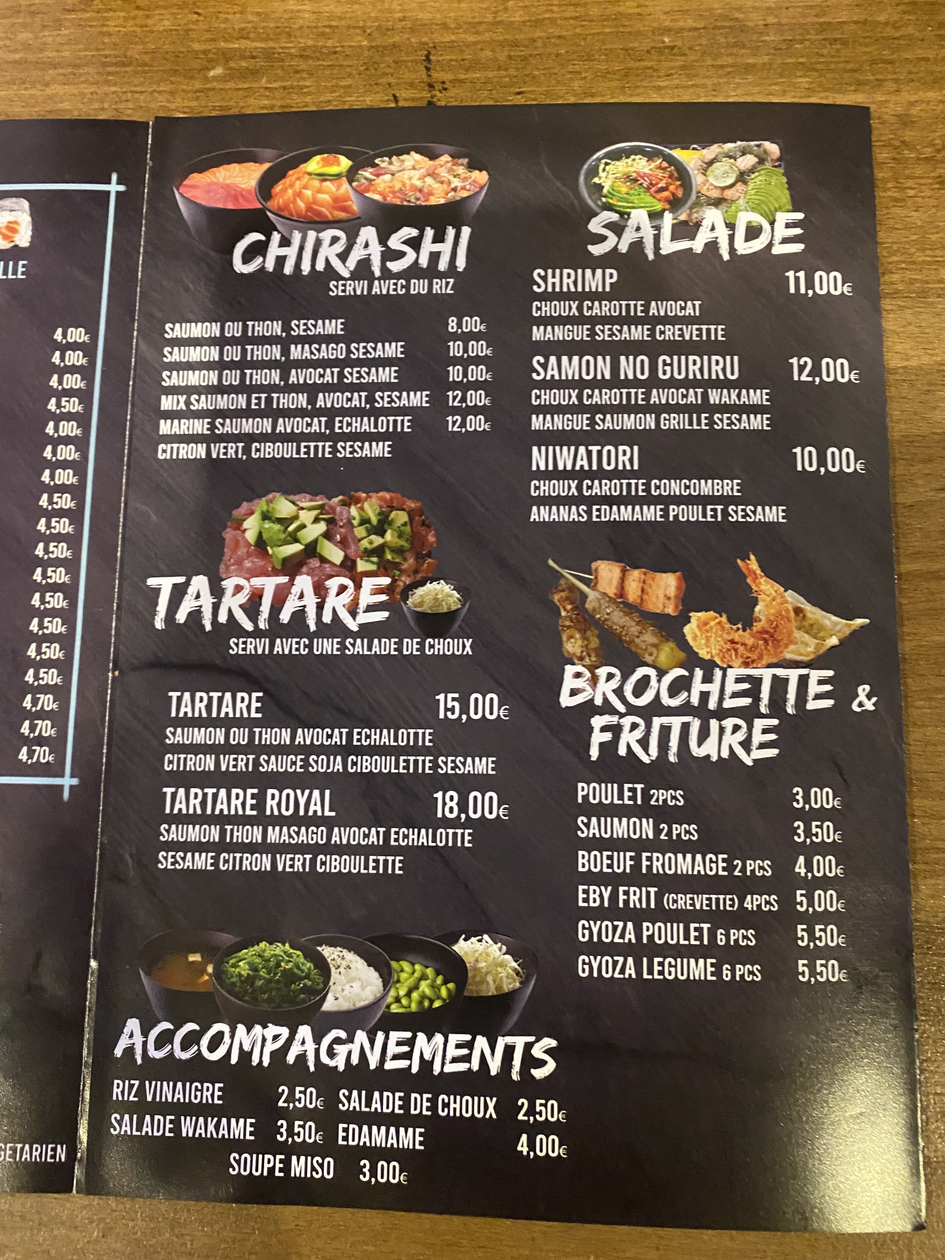 Délicieux Sushis et plats très bons prix très corrects et deux formules pour le midi en plus de la carte variée sur place ou a emporter Terrasse ombragée J y vais régulièrement avec plaisirs
