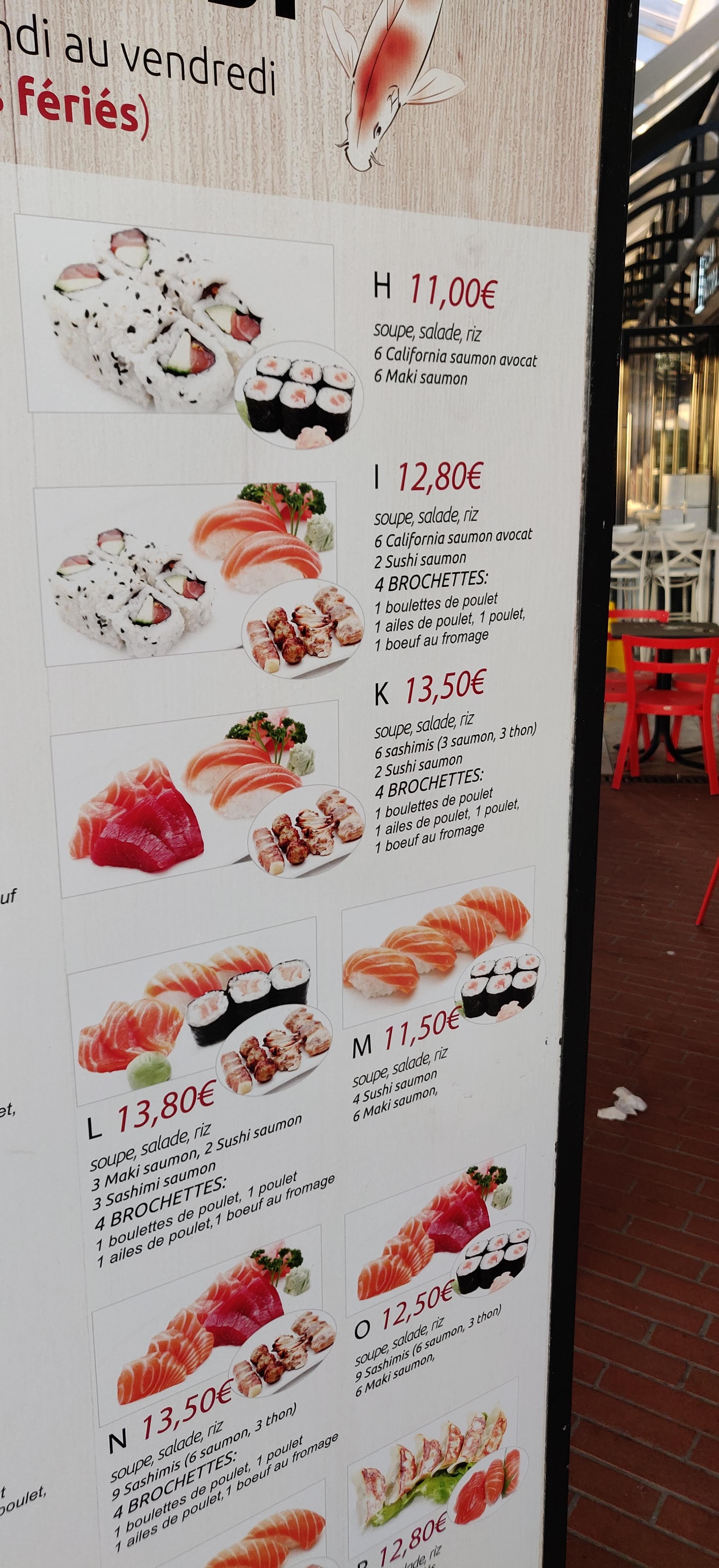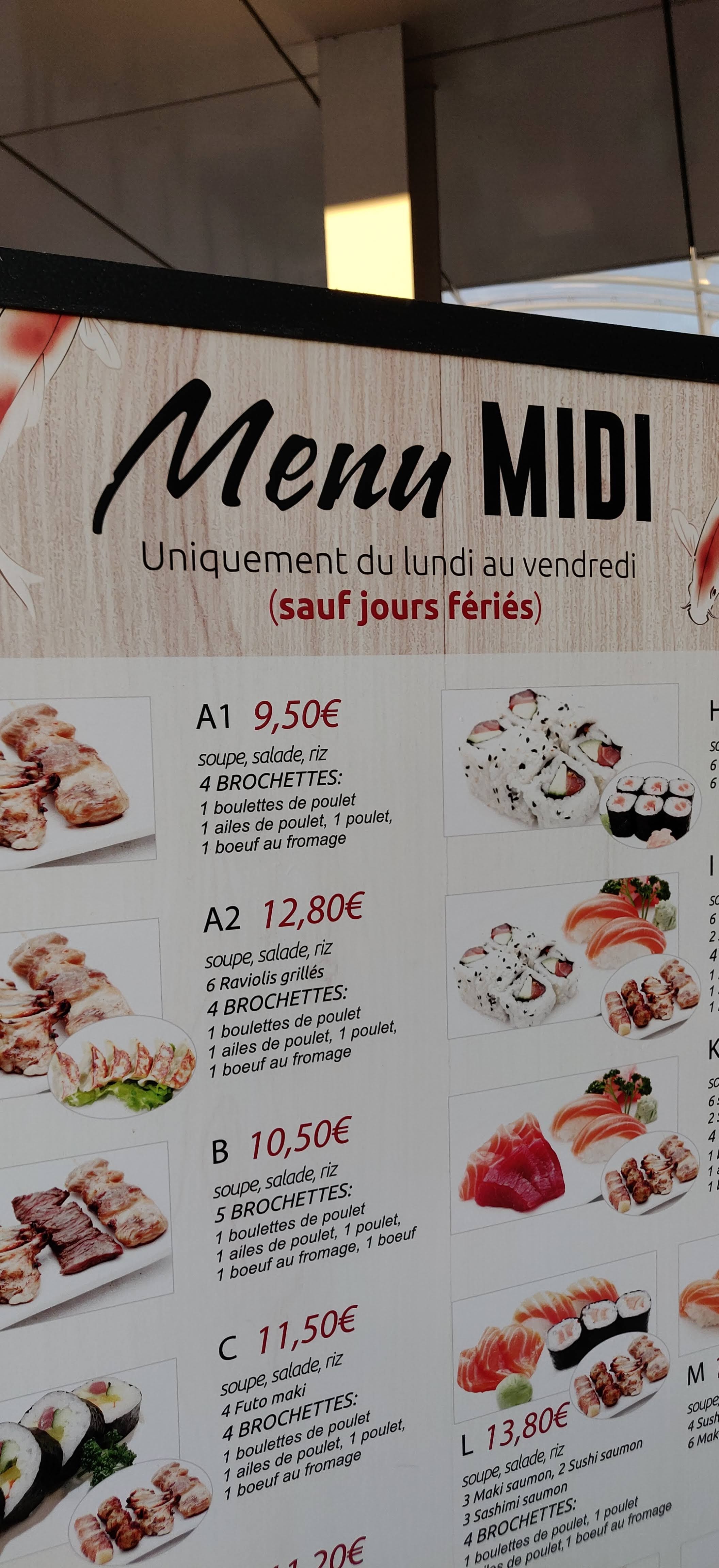 De très bons plats, sushis nourrissants. Existence d’un menu enfant et d’options végé. Cependant , les prix sont un peu élevés (2,5€ pour un simple bol de riz…).