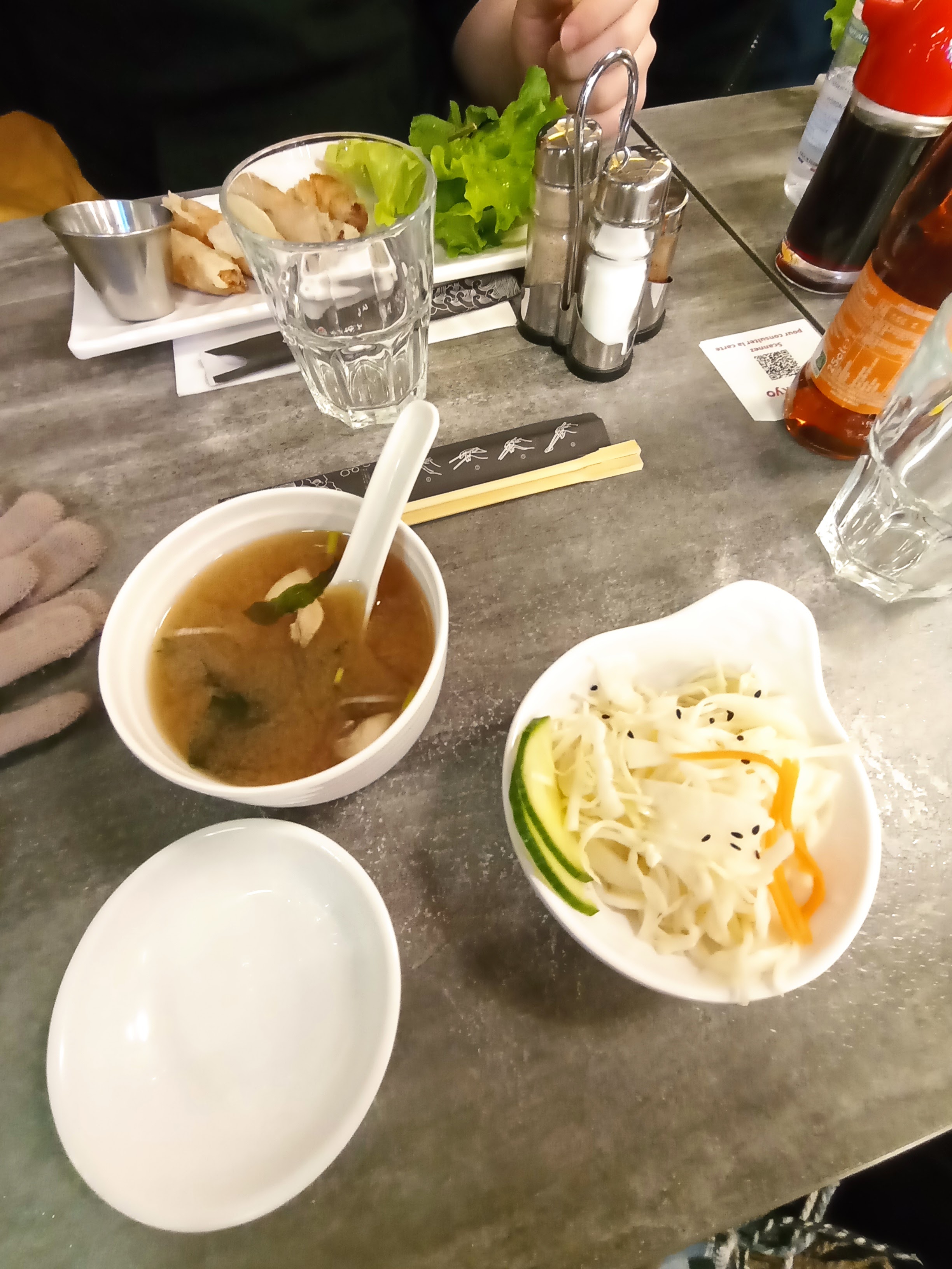 Posté le 17/01/2024 à 20:39"Top top top le meilleur japonais du coin, tout était bon, checkez mes photos, l'entrée (soupe et salade de chou) le plat (un plat vermicelles avec du poulet, légumes et nems au poulet, bon équilibre entre les saveurs et les aliments) et le dessert (bananes frites accompagné d'une glace vanille et du chocolat fondu🥲🥲) telleeeement bon La déco est super joli et on peut voir les menus avec une tablette."