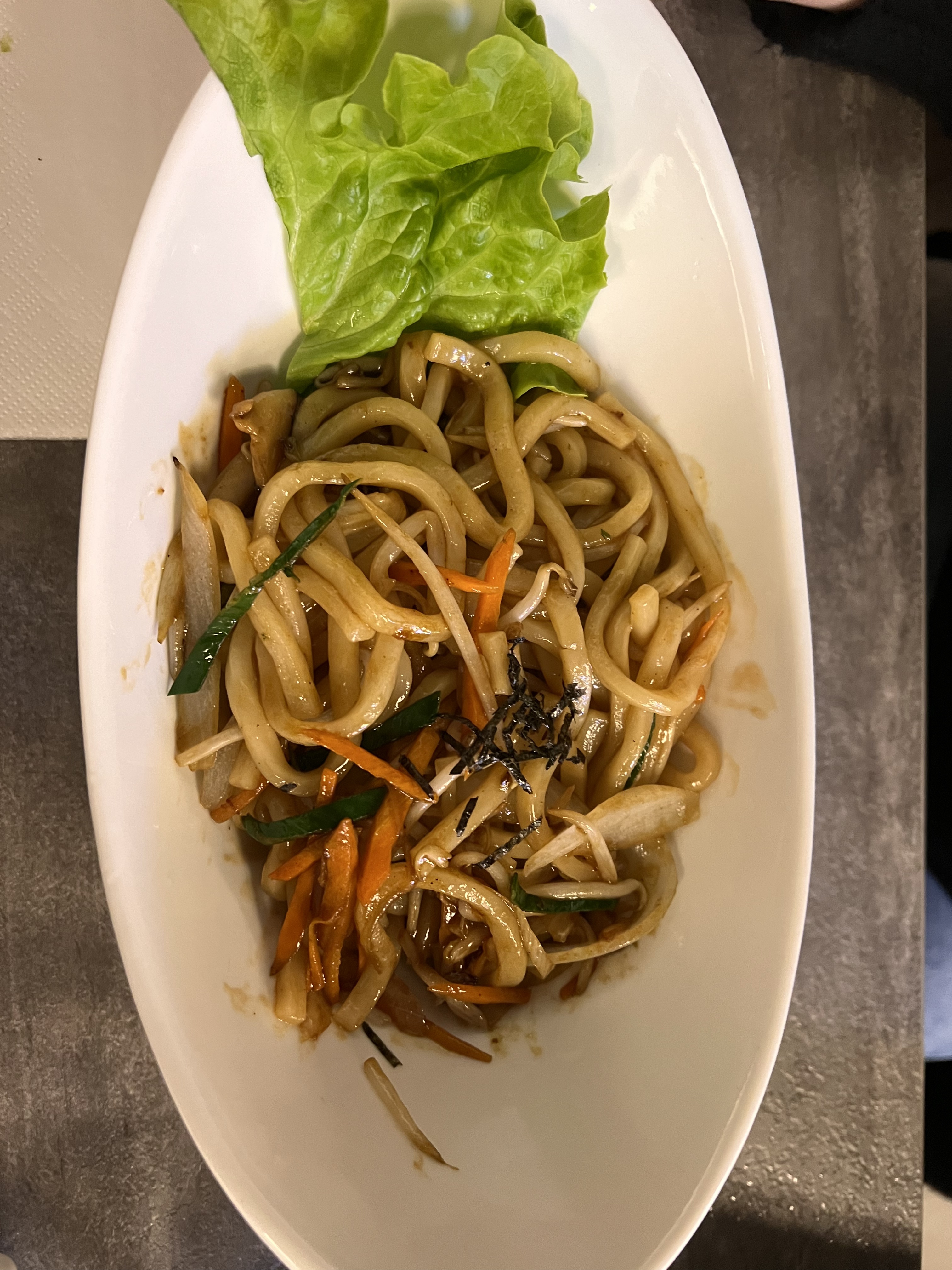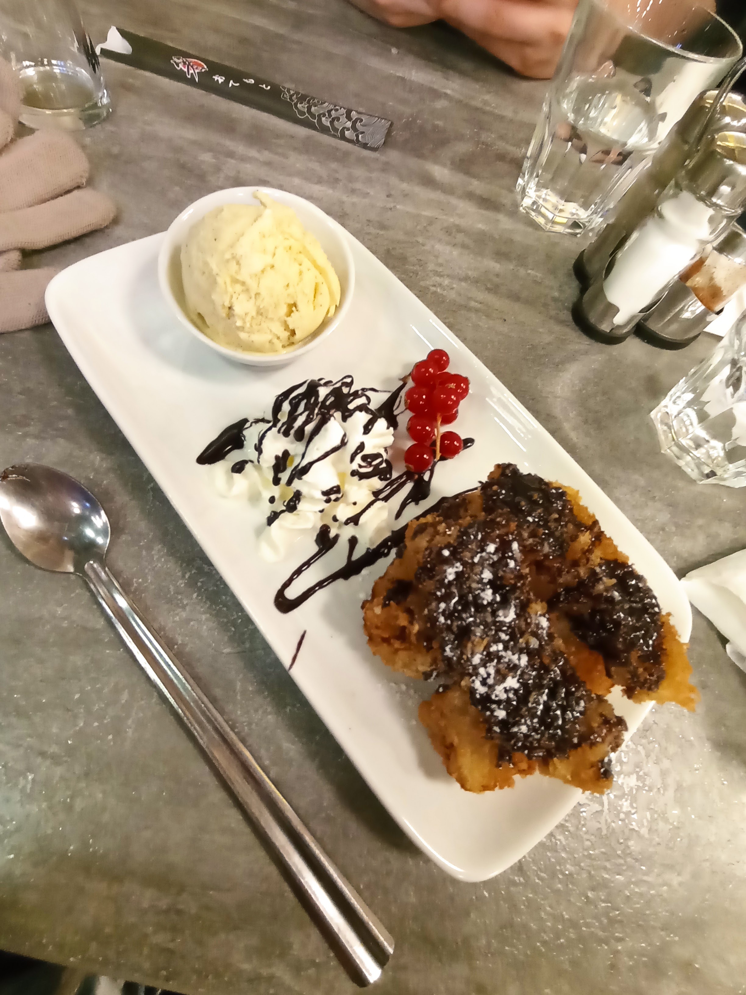 Top top top le meilleur japonais du coin, tout était bon, checkez mes photos, l'entrée (soupe et salade de chou) le plat (un plat vermicelles avec du poulet, légumes et nems au poulet, bon équilibre entre les saveurs et les aliments) et le dessert (bananes frites accompagné d'une glace vanille et du chocolat fondu🥲🥲) telleeeement bon La déco est super joli et on peut voir les menus avec une tablette.