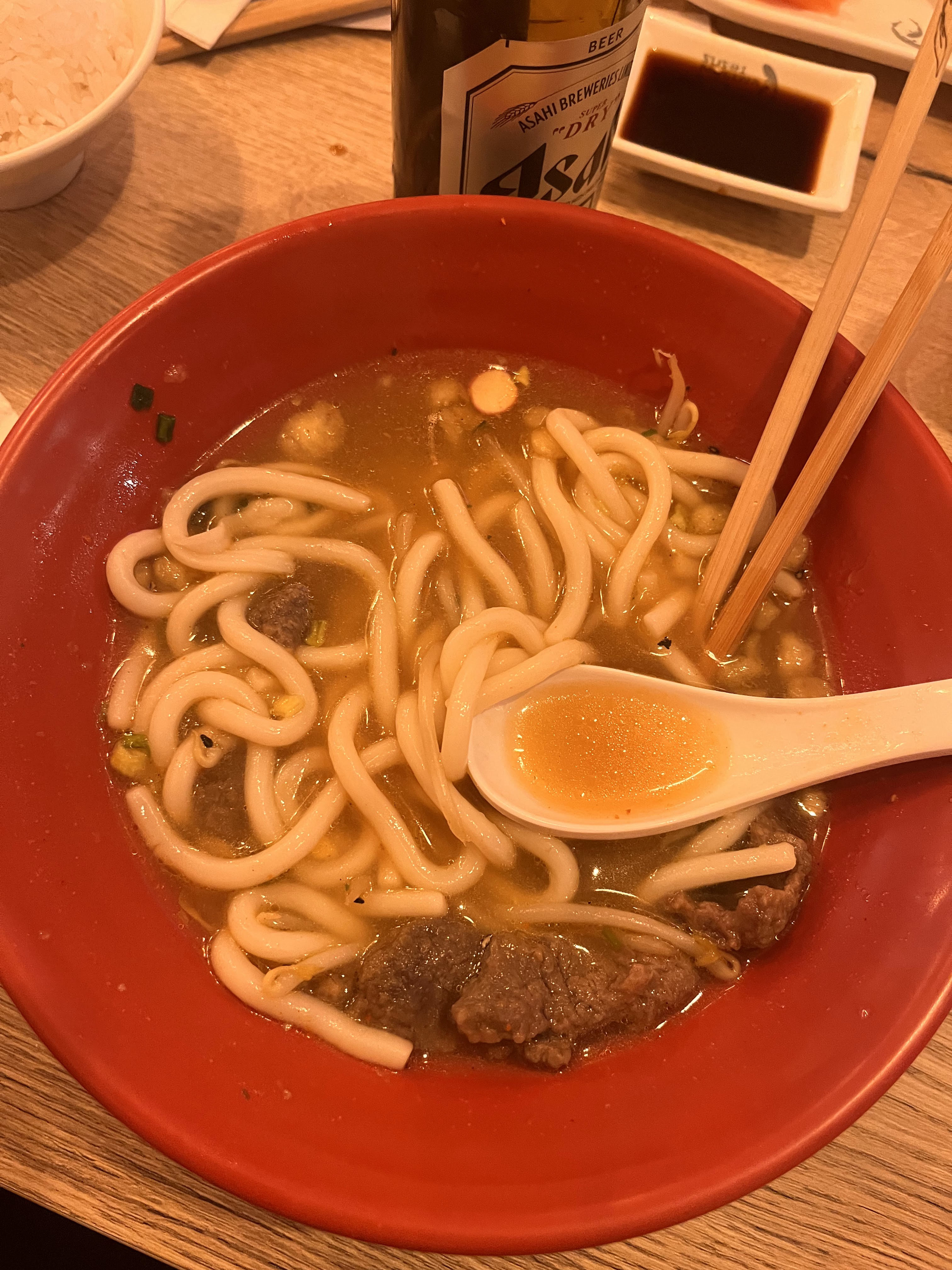 J'ai pris un menu composé (12,9€). Ce qui est cool c'est qu'une petite soupe et une salade de chou est servie avec, c'était vraiment bon! Service très rapide J'ai goûté les nems au poulet et les brochettes bœuf fromage : une tuerie ! Je ne pensais pas être calée si facilement mais au final, si. C'est très complet / copieux ! Une très belle découverte !