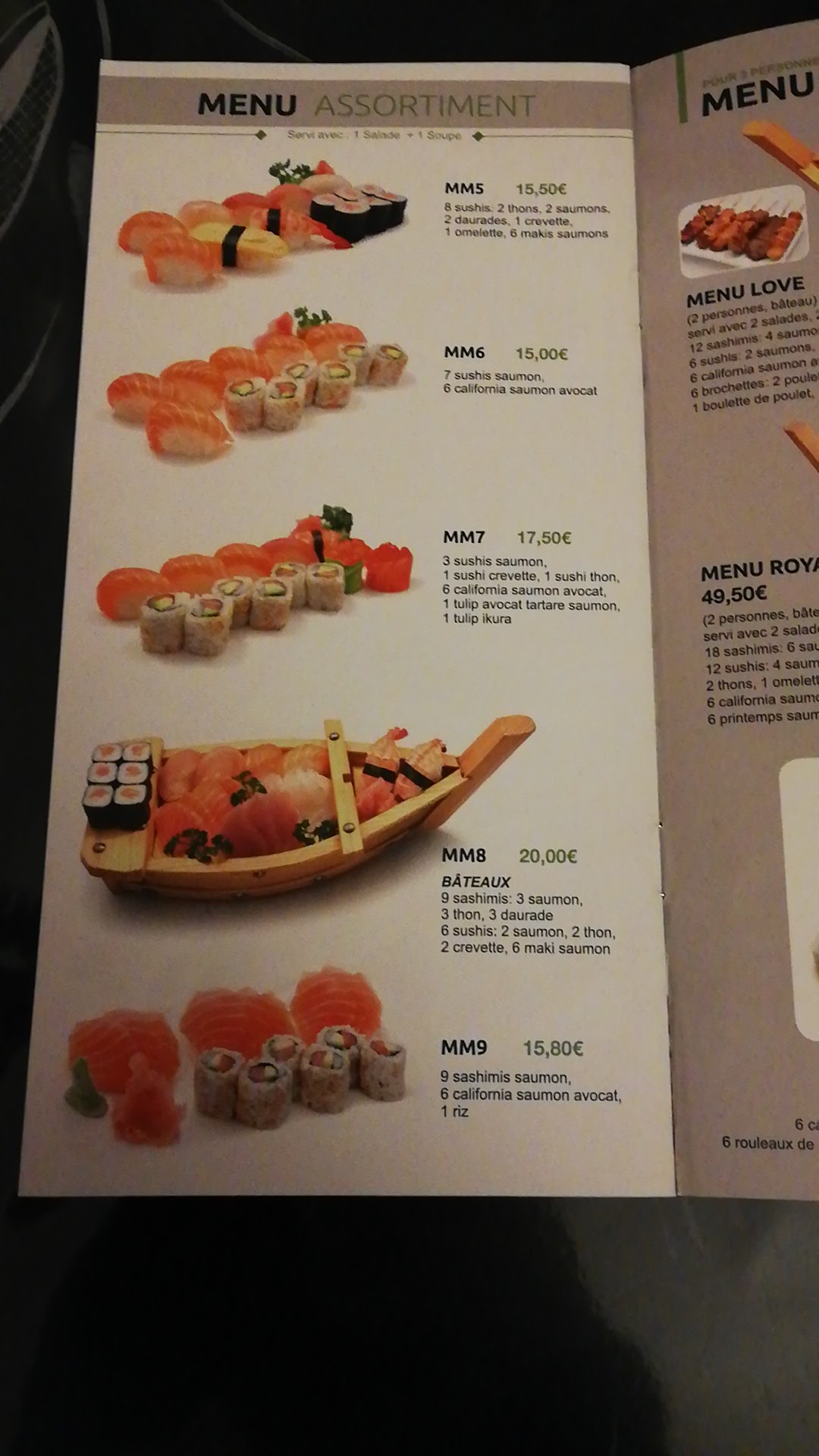 Vous avez commandé un menu MA ce soir là en demandant de modifier les 3 lots de makis parmi les 4 !!! J’ai pris mon temps pour comprendre ces modifications et au final il faut changer encore le 4 eme lot !!! Il faut commander à la carte si vous n’êtes pas d’accord avec ce menu MA pour simplifier la vie !