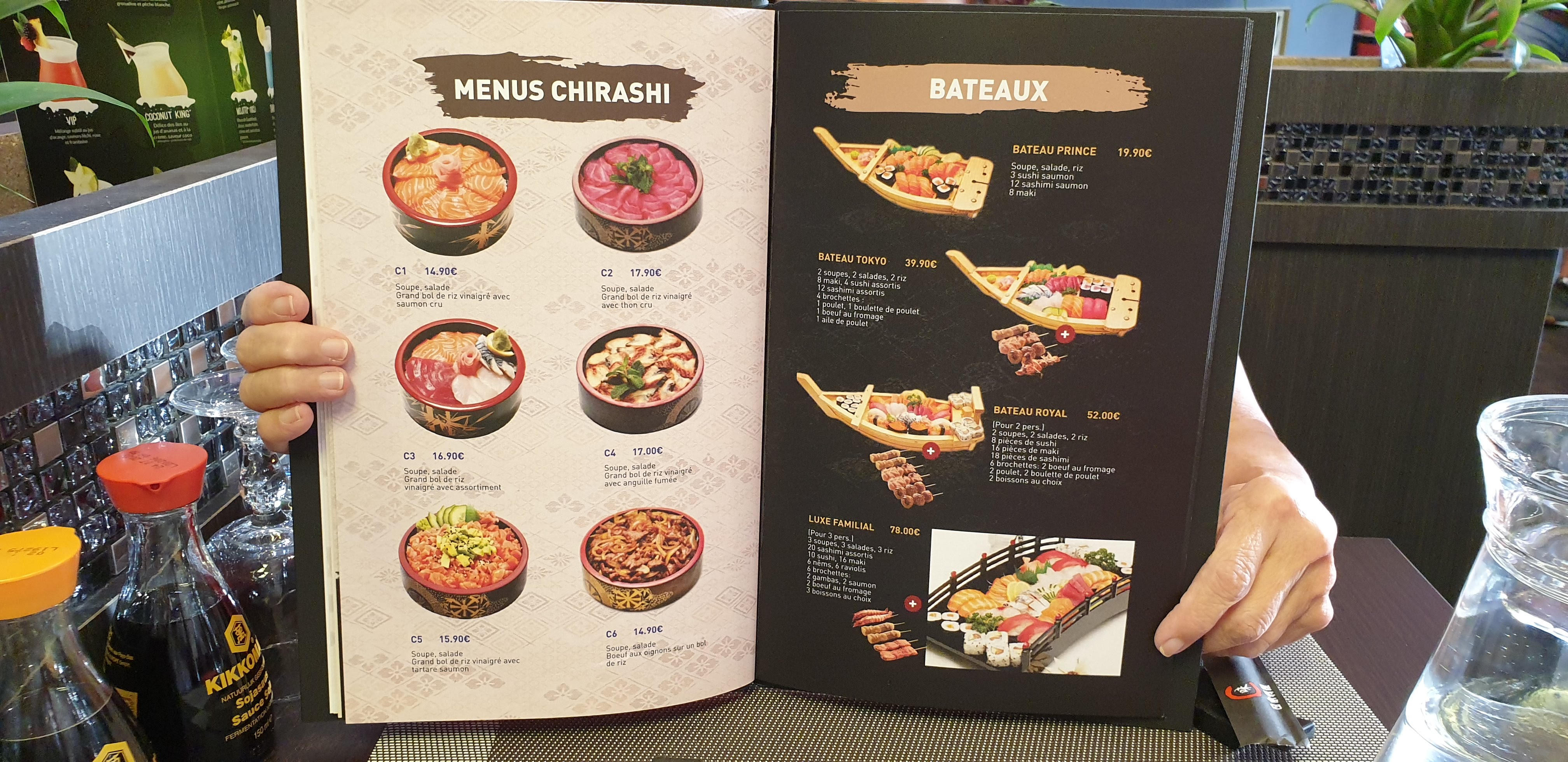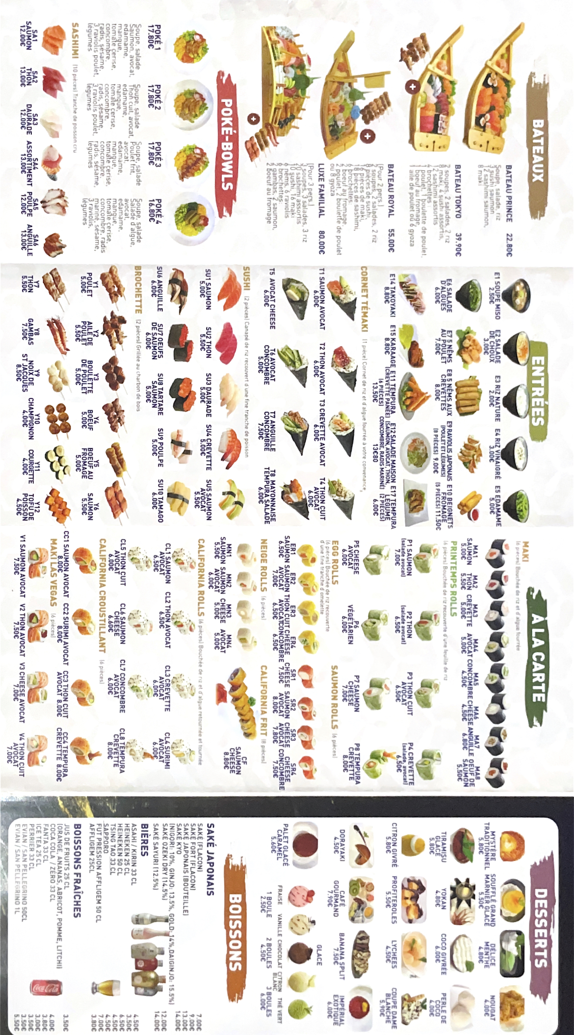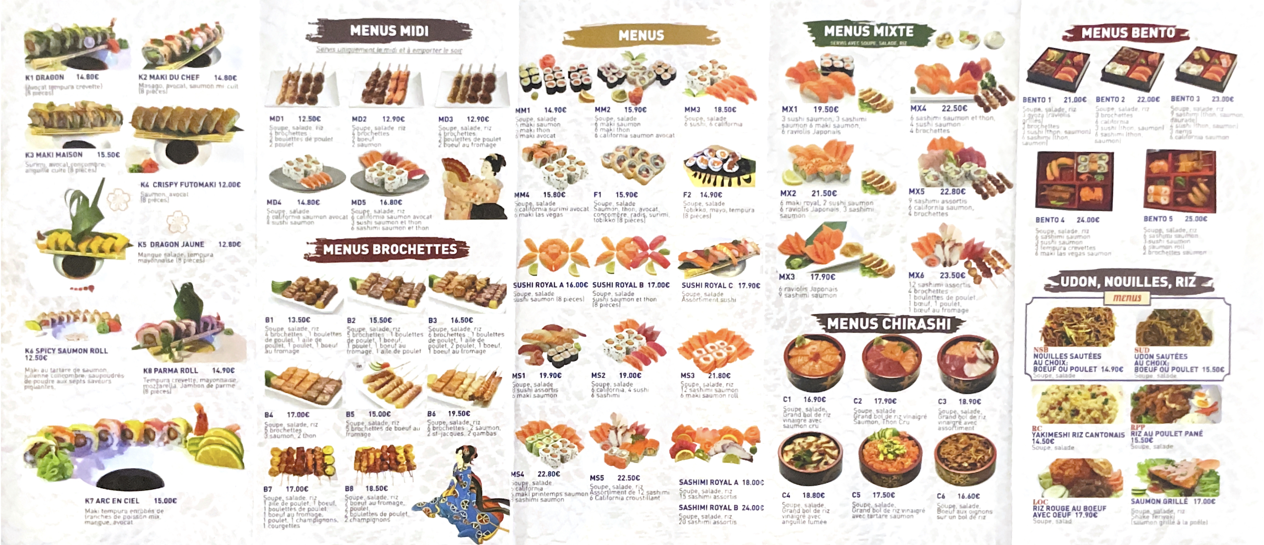Plat à emporter mx1 et mx6 pour moins de 40 €. C'était très bien pour notre fille qui souhaitait découvrir la cuisine japonaise. Un petit bémol, la soupe manqué de goût. Mis à part ça, tout est très bien.