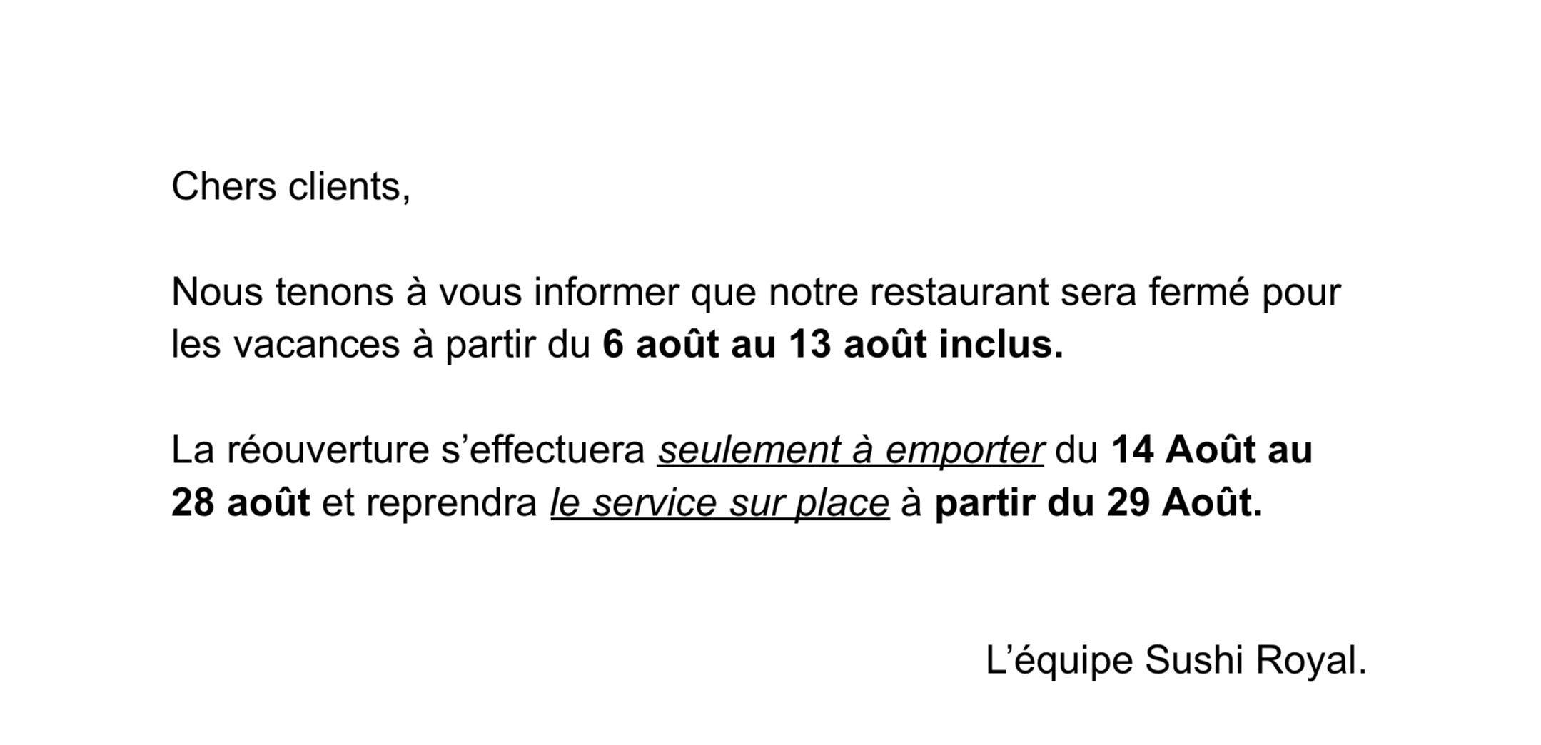 Bonjour Madame Camille Dourlent, Merci pour votre avis positif. La satisfaction de nos clients étant notre priorité. Nous espérons vous revoir très prochainement. Bonne journée à vous, L’équipe Sushi Royal