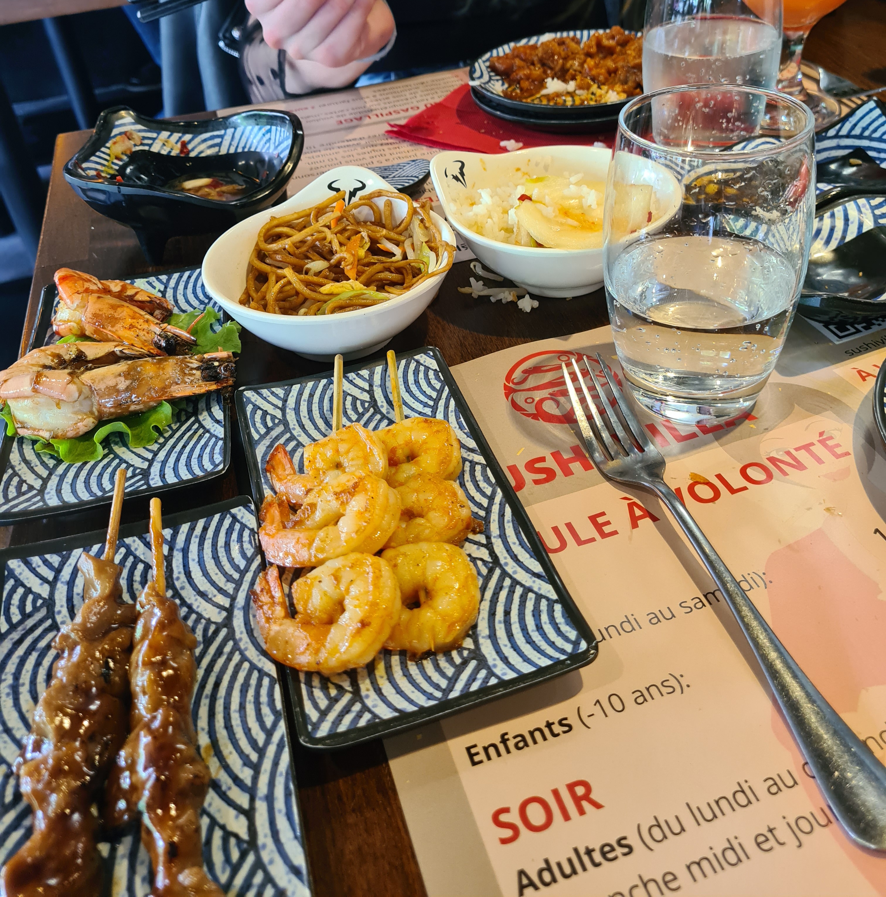 Super restaurant à volonté où les repas se commandent sur une tablette, soit beaucoup plus hygiénique que lorsqu’on se sert soi-même. On commande ce que l’on veut et nous avons le droit à 5 assiettes par personne toutes les 10 minutes (autant dire autant qu’on veut quand on veut). Le service est rapide et les serveurs aimables. Les desserts se prennet sur le principe d’un restaurant à volonté basique où l’on se lève pour se servir ce que l’on veut (pas mal de choix en desserts aussi dont la fontaine à chocolat haha) J’ai personnellement apprécié en particulier les sushis que j’ai trouvé excellent et dont il y avait beaucoup de choix différents. Je conseille vivement ce restaurant pour les amateurs de sushis et des plats aux saveurs asiatiques