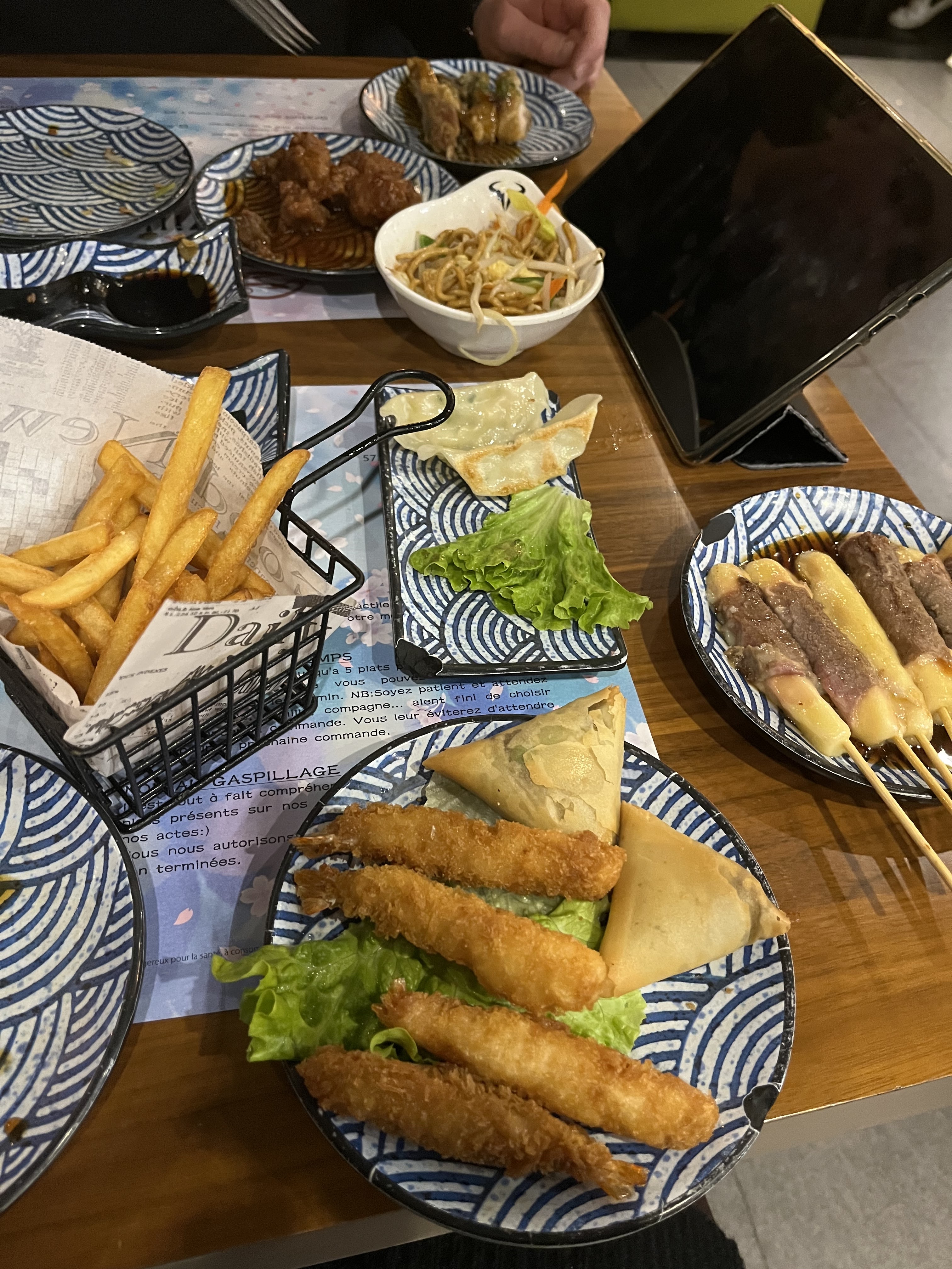Ma femme et moi sommes allés dans ce restaurant a midi, bonne surprise, on commande sur tablette, donc on choisit sur petite photos, bon ça va, mais une fois qu'on commande tout arrive en même temps les entree froide, entree chaude.le plats principale, j etait surpris, mais bon,le seul truc qui me dérange c est les beignets de crevettes qui me sont restés sur l estomac. Trop gras.le reste etait bon. Mais j'ai essayé je ne reviendrai pas. Bonne journée. Fabrice.