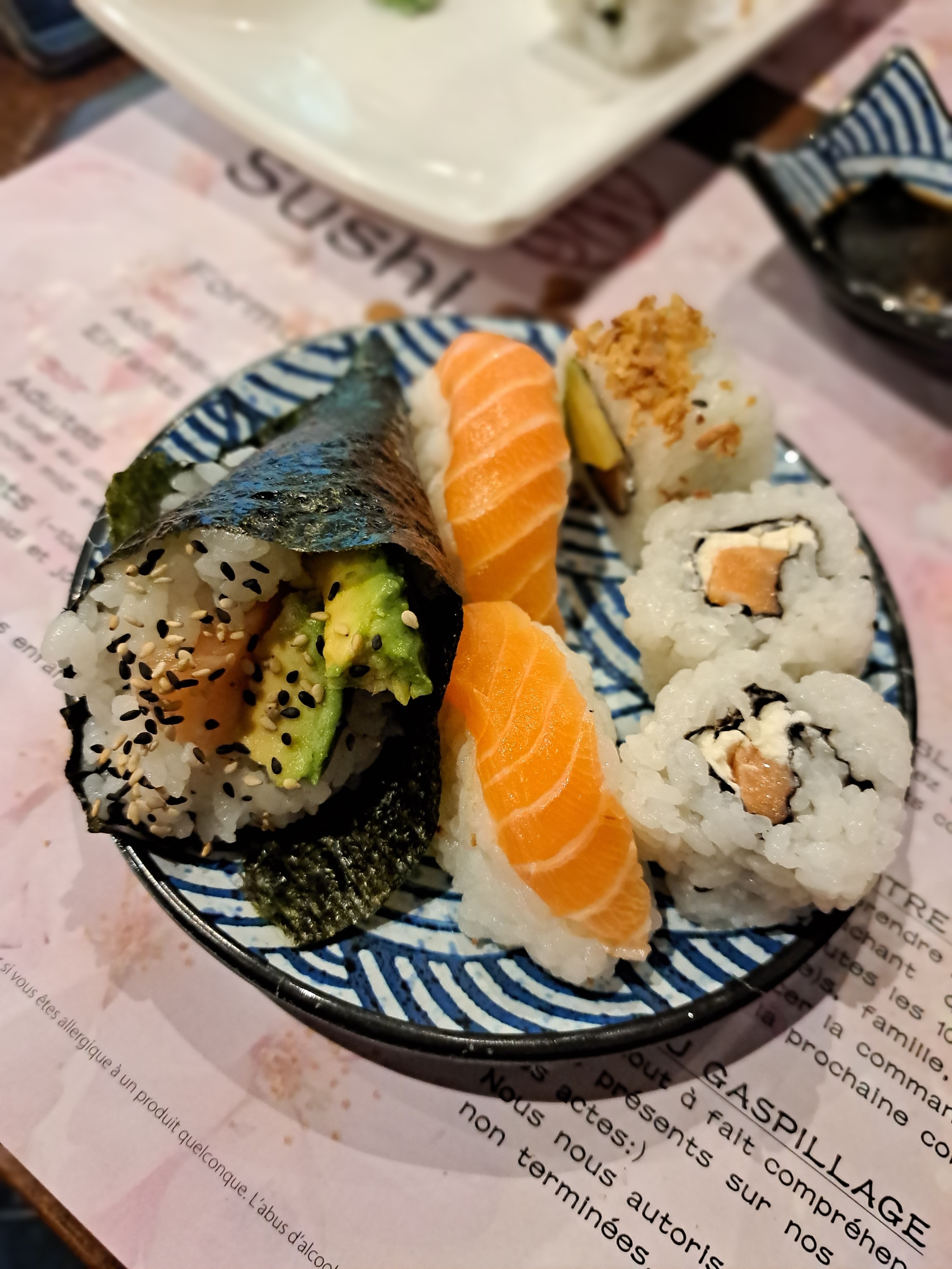 Super bon, les sushi sont énormes vrm très savoureux et généreux. Le restaurant et très beau et propre, le petit robot chat qui sert et vrm pratique👍🏻