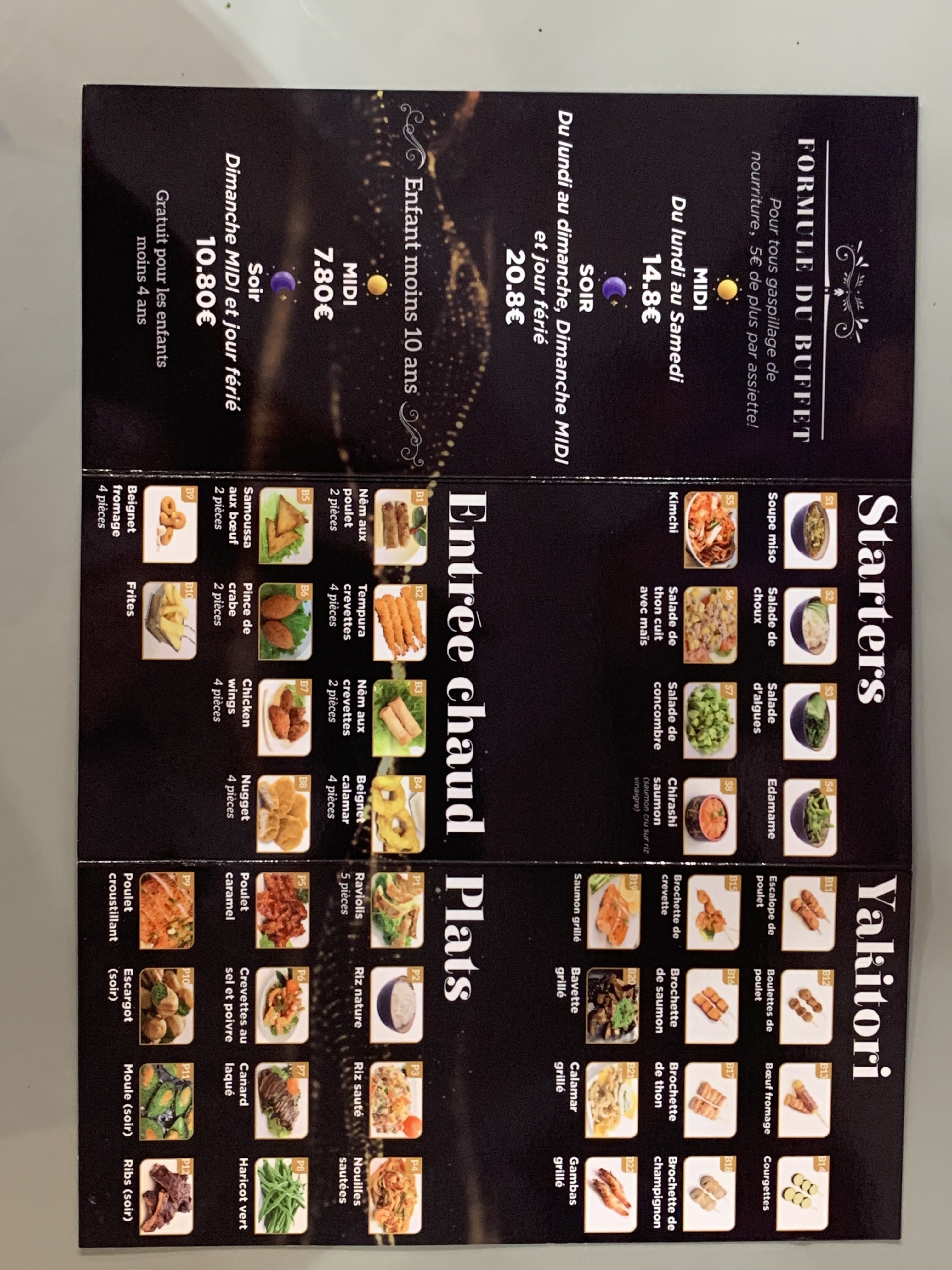 Arrivée par hasard avec mon mari et ma fille, nous avons été très bien accueilli. C'est un système de commande des plats sur tablette à volonté (5 plats possible par personne toute les 10 mn). C'est vraiment très bon. Je recommande à 100 pour 100.
