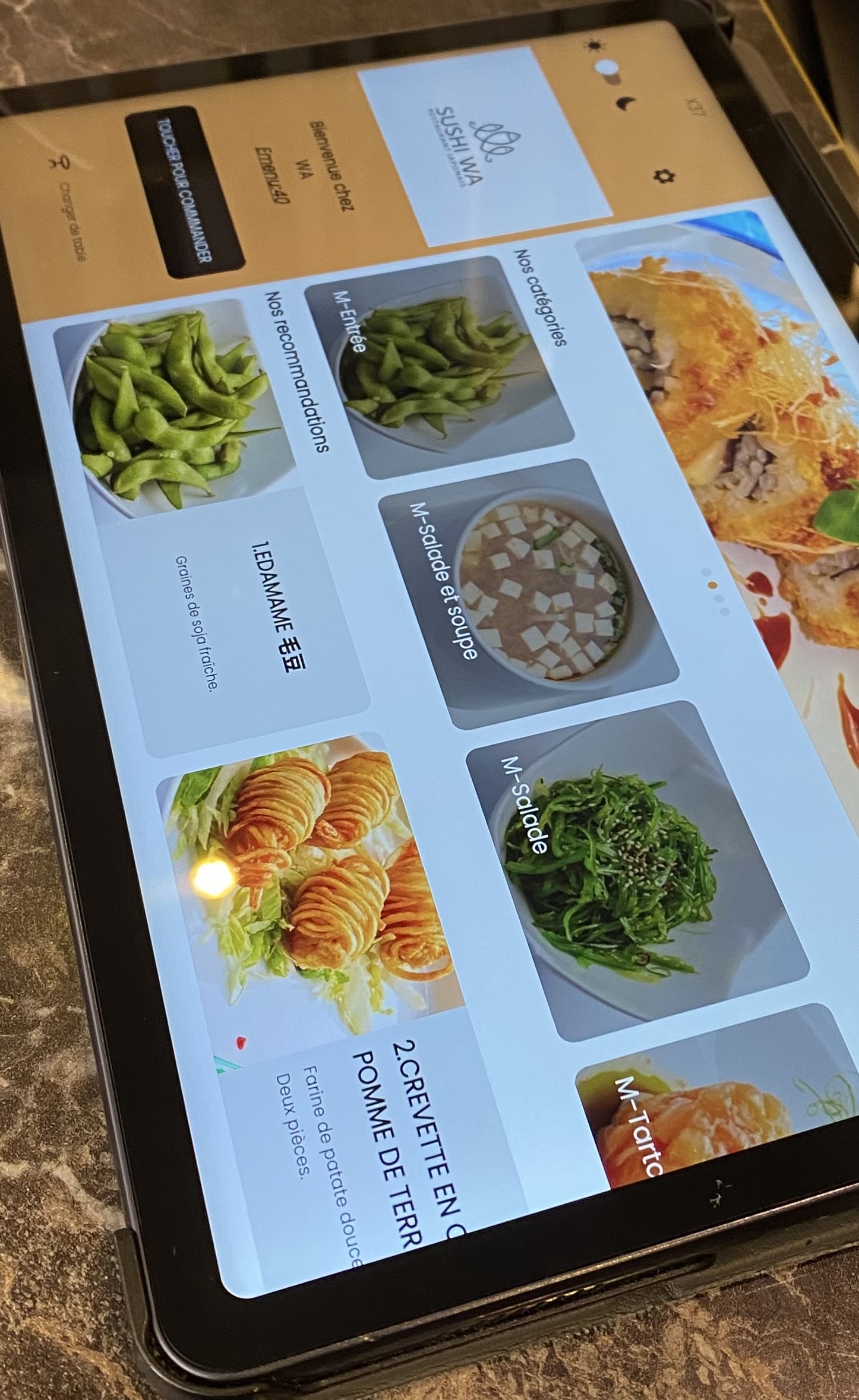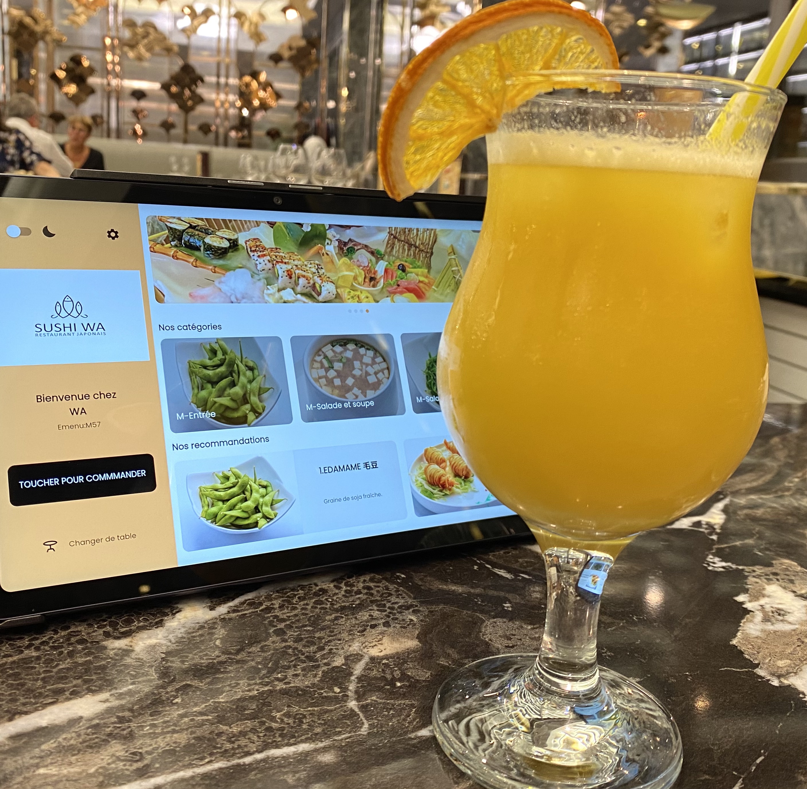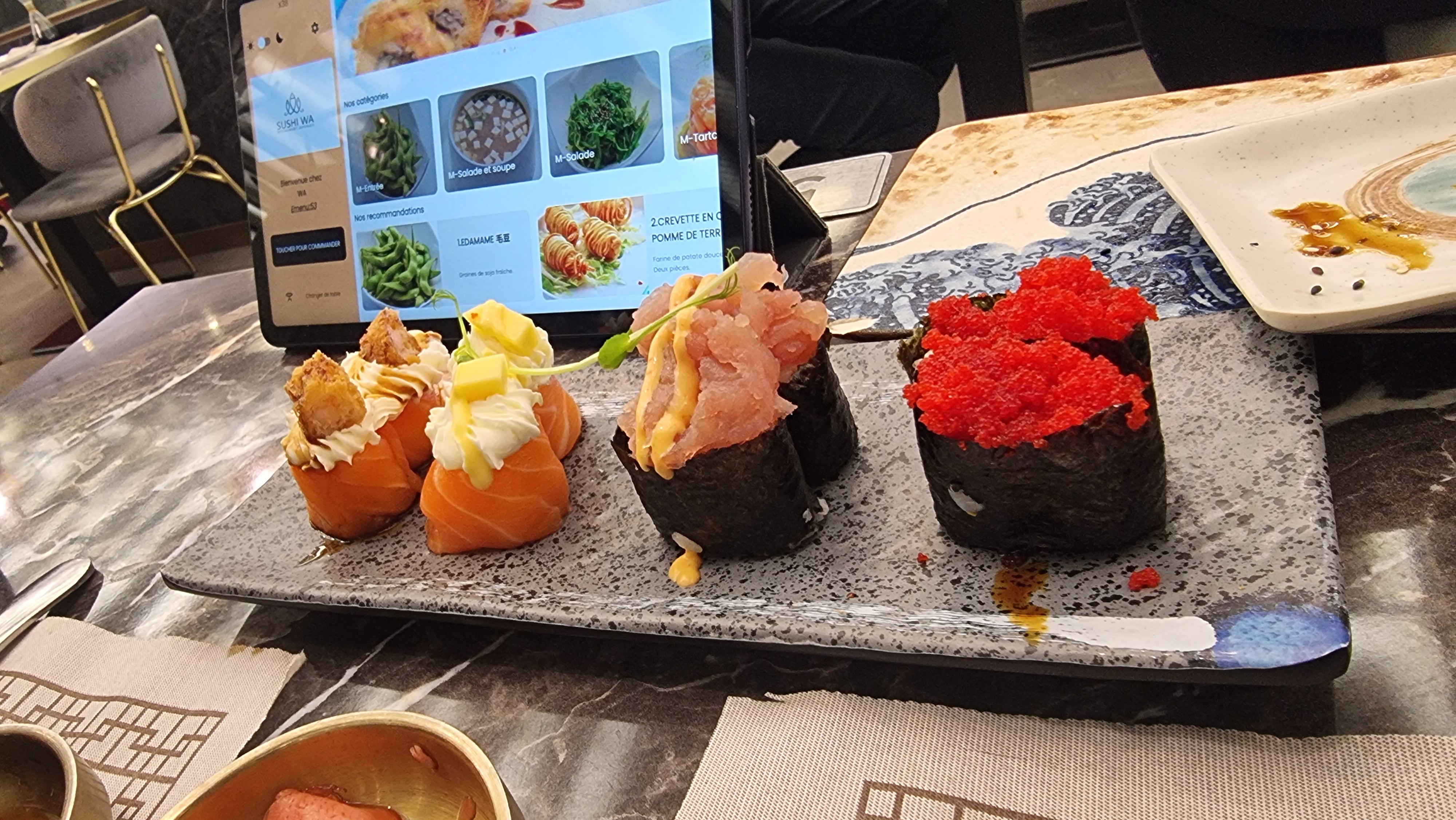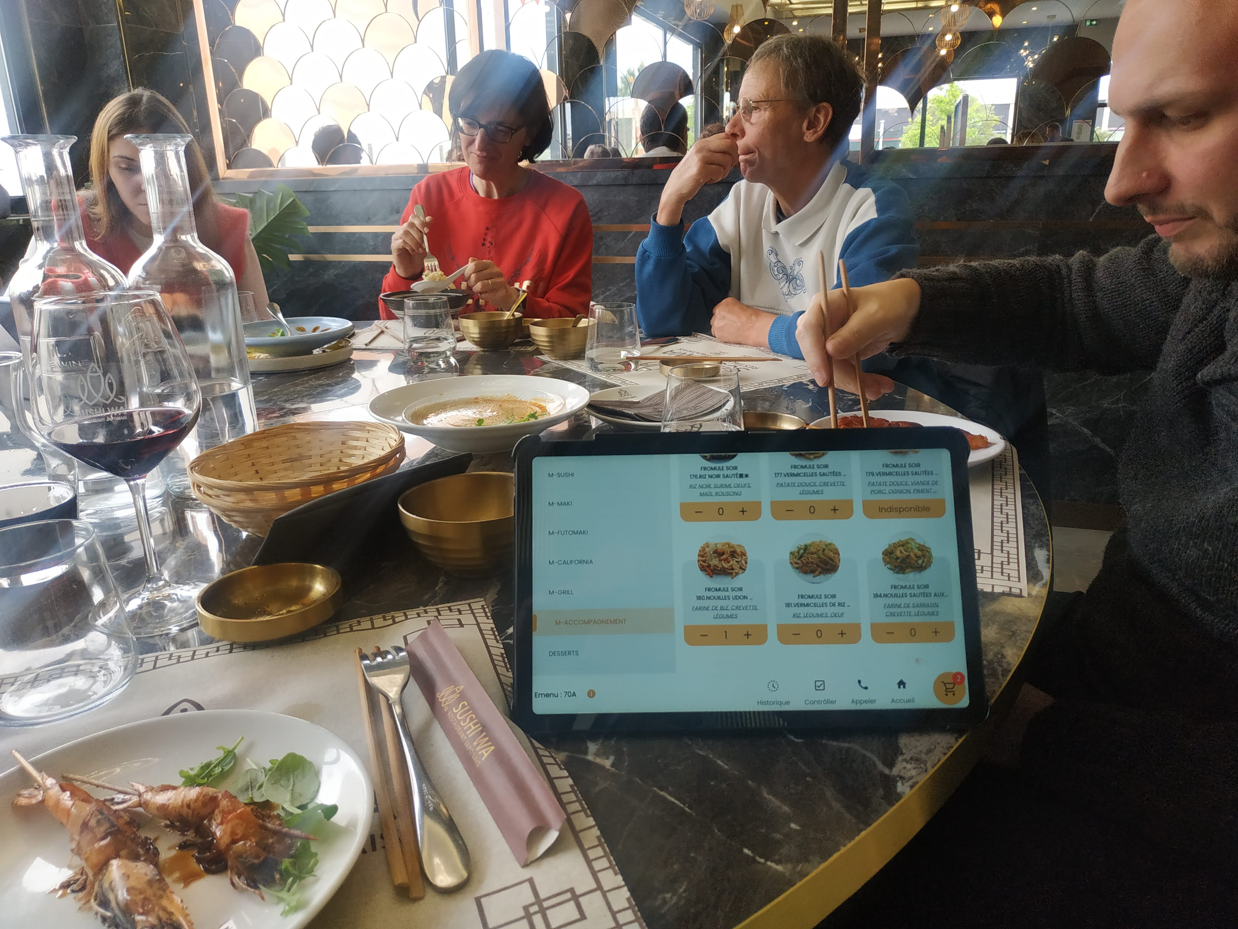 Je n'ai pas aimé le principe de la tablette pour la commande. Trop fouillis à l'arrivée des plats pas toujours chaud et qui sont servis trop vite. Nous étions 14.....je ne vous dis pas le bazar!!!!!!!!.