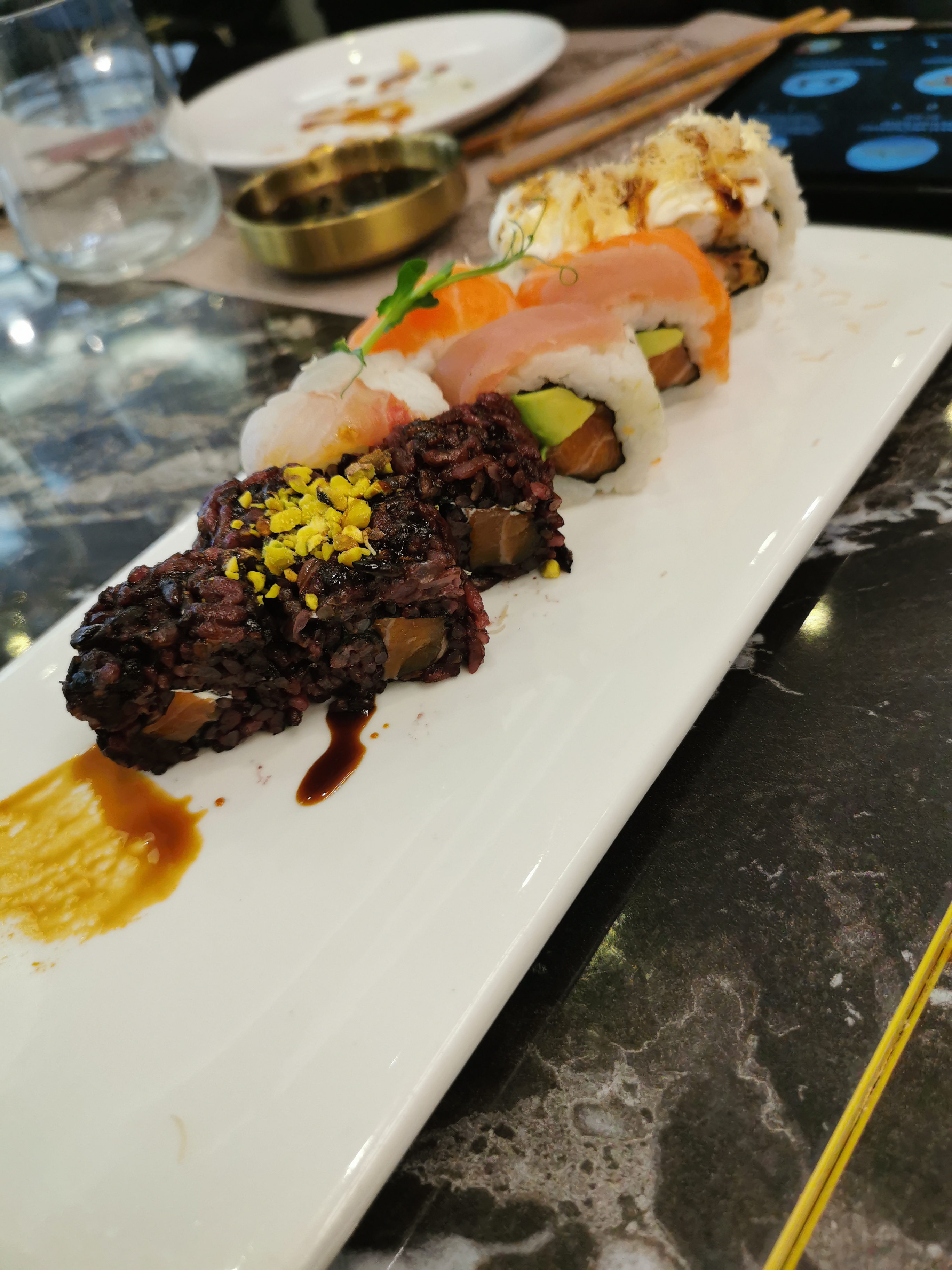 Très dépaysant, 🍣 très très bon, avec système de commande et de services moderne. Apparemment une hygiène parfaite et maîtrisé (précision importante car restaurant de 🐟 cru). Le lieu est joli et confortable. Pour ma part, juste dommage que nous soyons en zone industrielle mais c'est très personnel et quand on comprend le concept c'est normal ...
