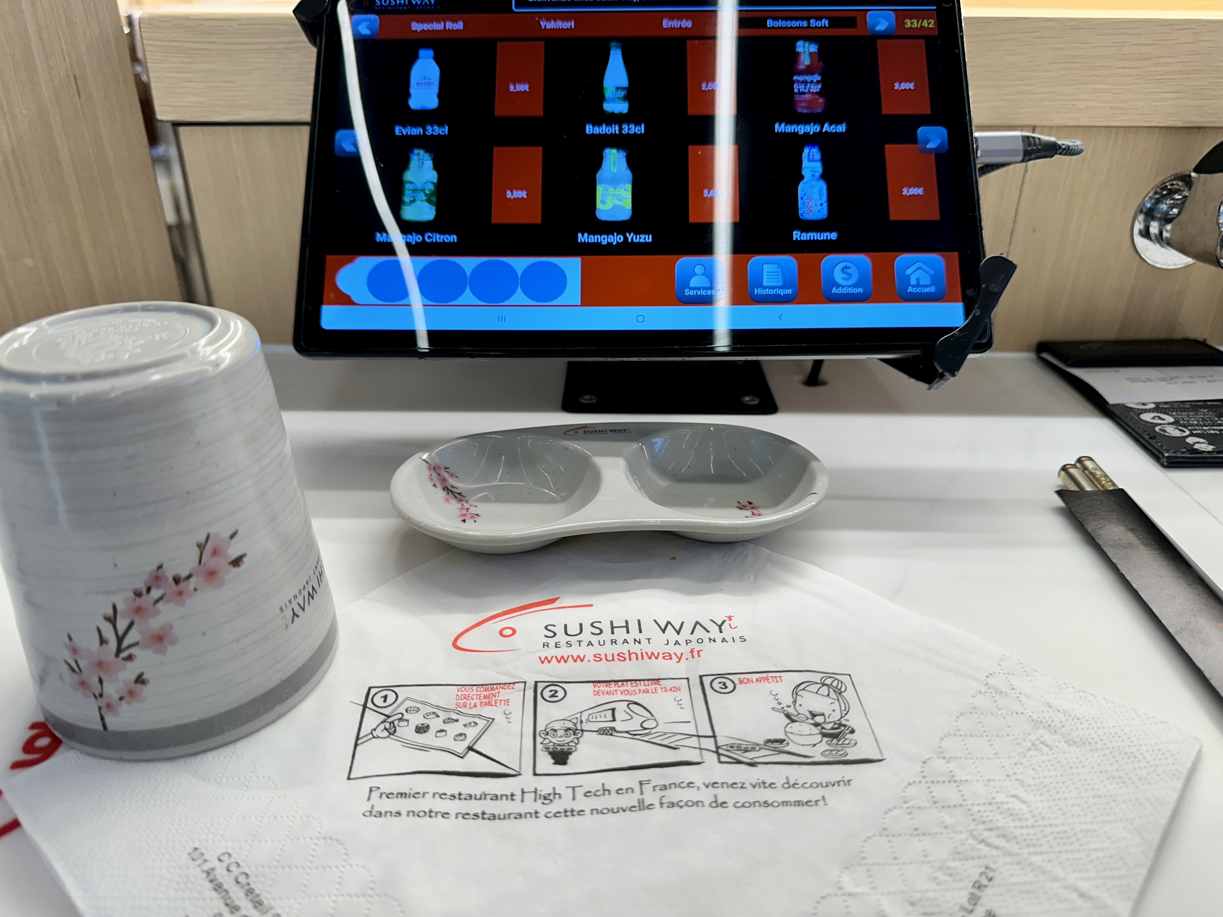 Posté le 28/12/2023 à 20:13"Restaurant propre et amusant pour les enfants avec le concept du mini plateau train qui vous livre sur le côté de la table. Vous avez l'opportunité d'un mini robinet d'eau sur votre table pour boire à volonté. Comptez une fourchette de 13€ minimum par plats et personne. Nous avons goûté plusieurs plats, qui sont servis chauds, au fur et mesure de nos commandes sur la tablette positionnée sur la table. Les plats n'ont pas de saveurs, pour les prix ! Malheureusement, le service des serveuses est froid et insignifiant. Aucun sourire ou aimabilité. Une sorte d'usine à débarrasser vos assiettes, pour accélérer votre départ! Les baguettes que vous n'utilisez pas sont immédiatement débarrassées, celà vous donne le sentiment d'être malhonnête !"