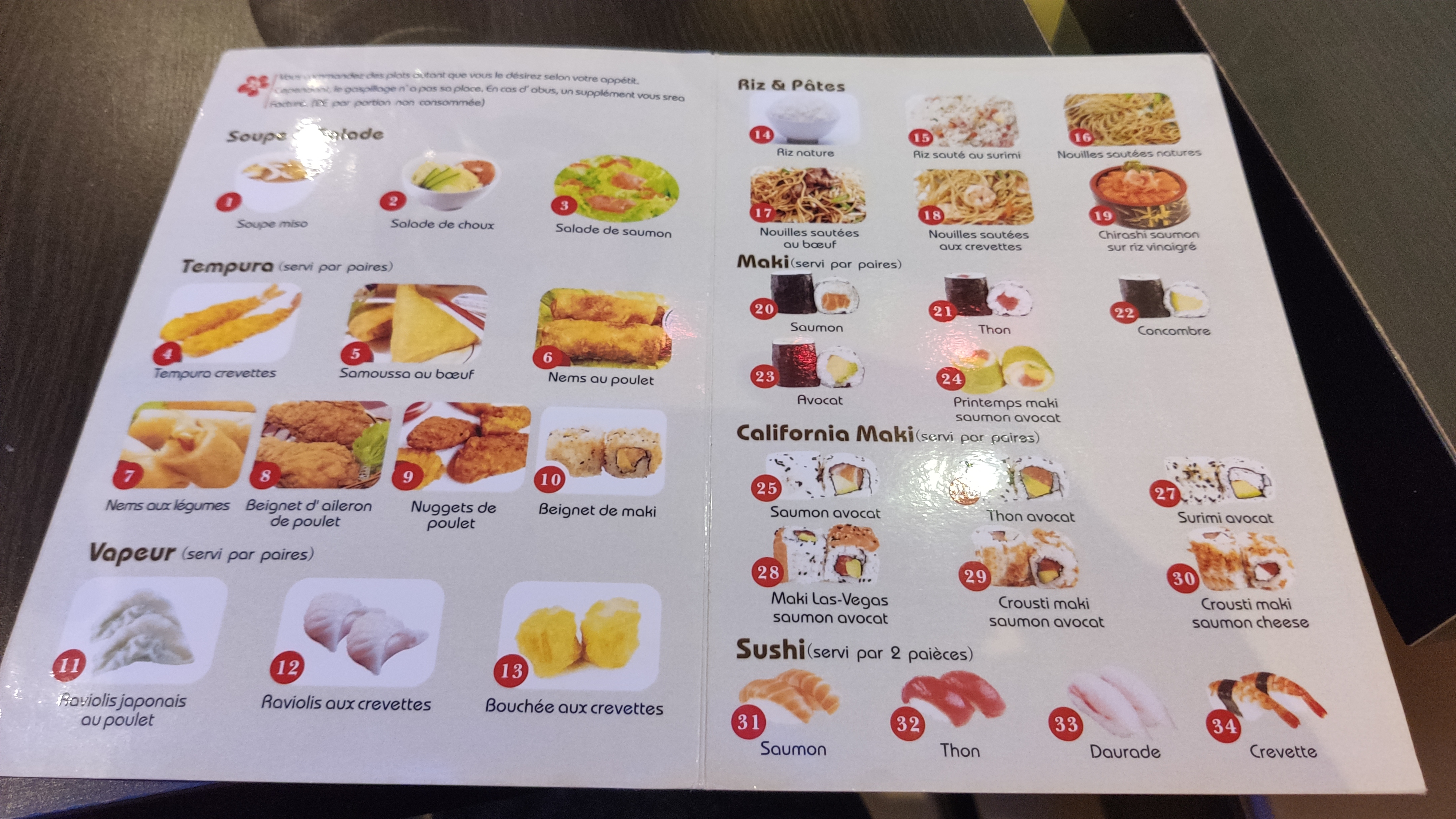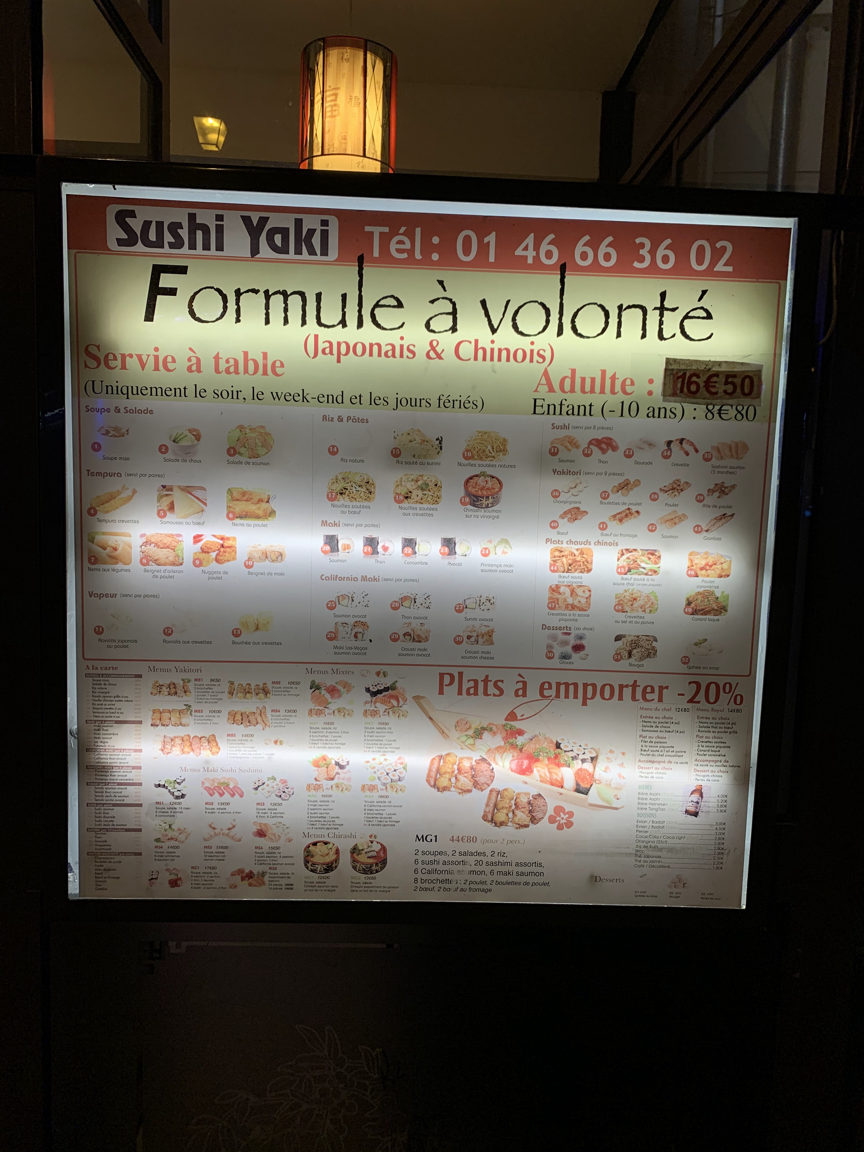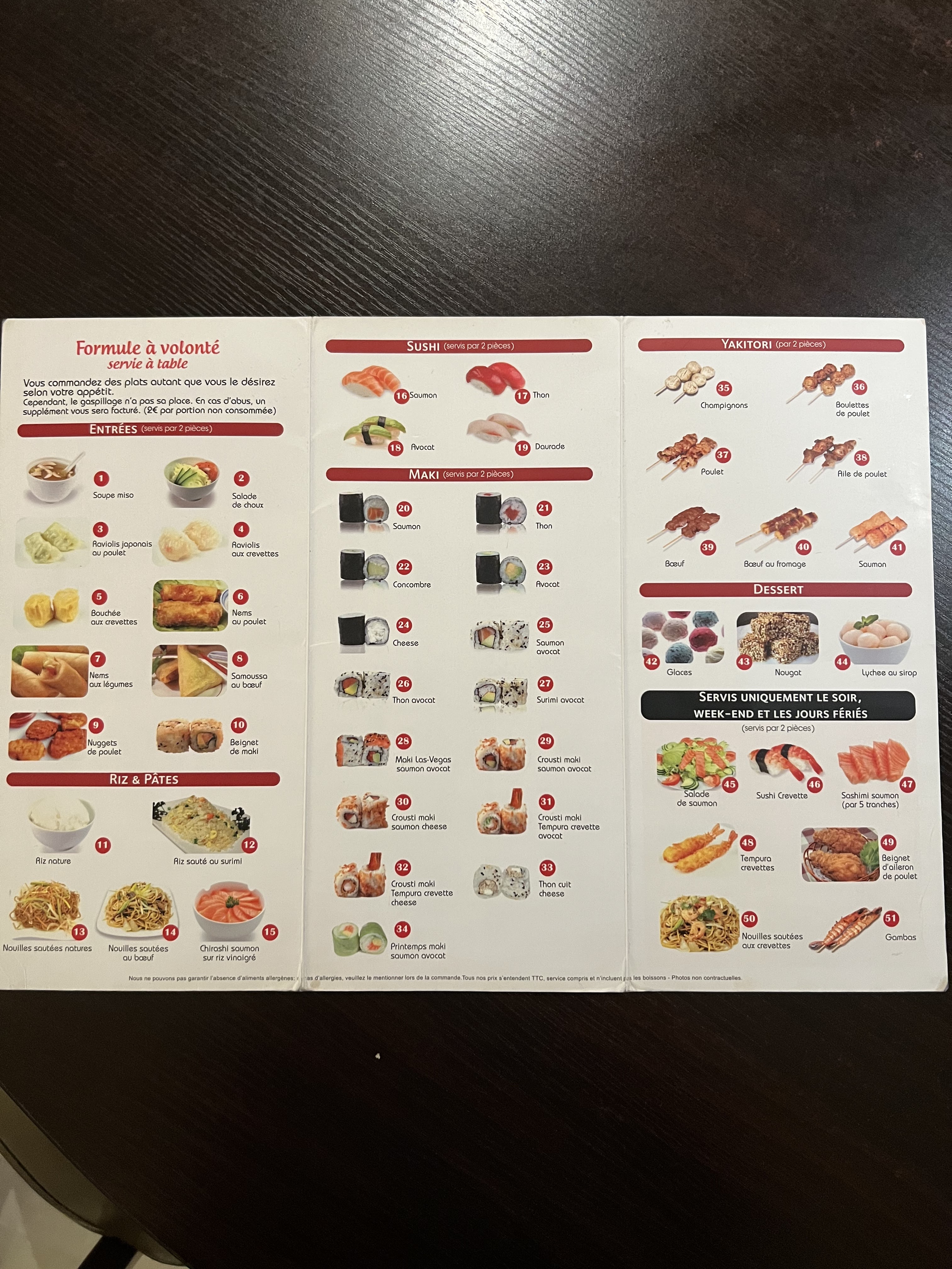 Menu à volonté le soir et buffet à volonté le midi. Très peu de choix par rapport à d'autres buffets à volonté japonais mais les makis sont bons et pas trop gros. Enfin, le personnel est très gentil.