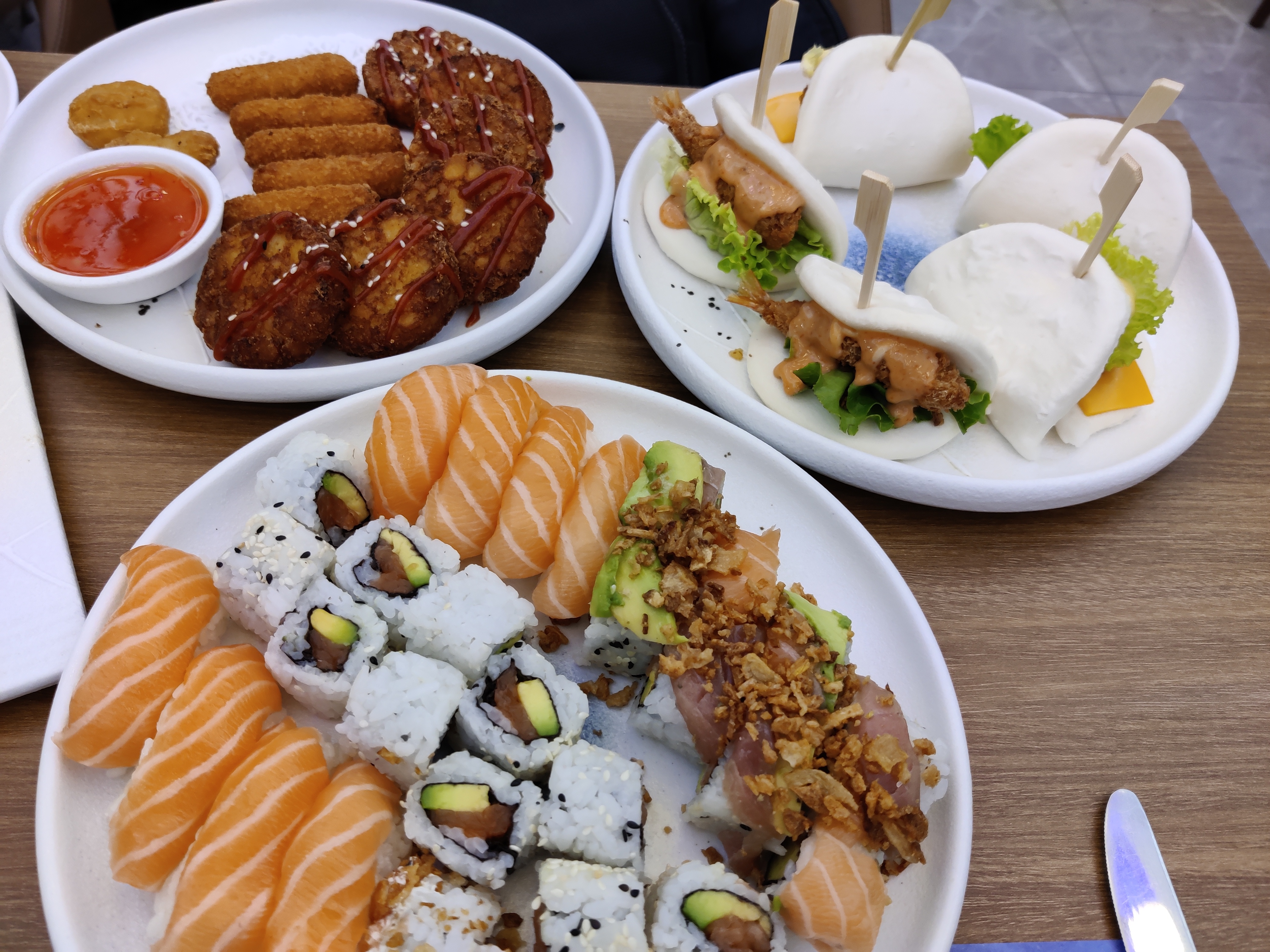 Alors alors... Nous y sommes allés le jour de l'ouverture soit.... Mais.... Au delà du fait que le service ai été d'une lenteur à toute épreuve et que plusieurs plats ne soient tout simplement jamais arrivés et qu'il y ai eu beaucoup d'erreurs dans ce qui tout a été servi... Certains plats ne sont pas conformes l'image sur la carte.... Les bao poulet par exemple... De plus ce n'est pas d'une bonne qualité. La viande des tatakis de bœuf étaient vraiment très dure... et tataki c'est vite dit, boeuf ou thon ça n'avait rien d'un tataki. La tranche de boeuf état froide et quasi crue. Les beignets sont bas de gamme. Seul les sushis et makis que nous avons eu étaient corrects. Pas de desserts. 2 étoiles pour l'équipe sympathique et l apéritif offert.