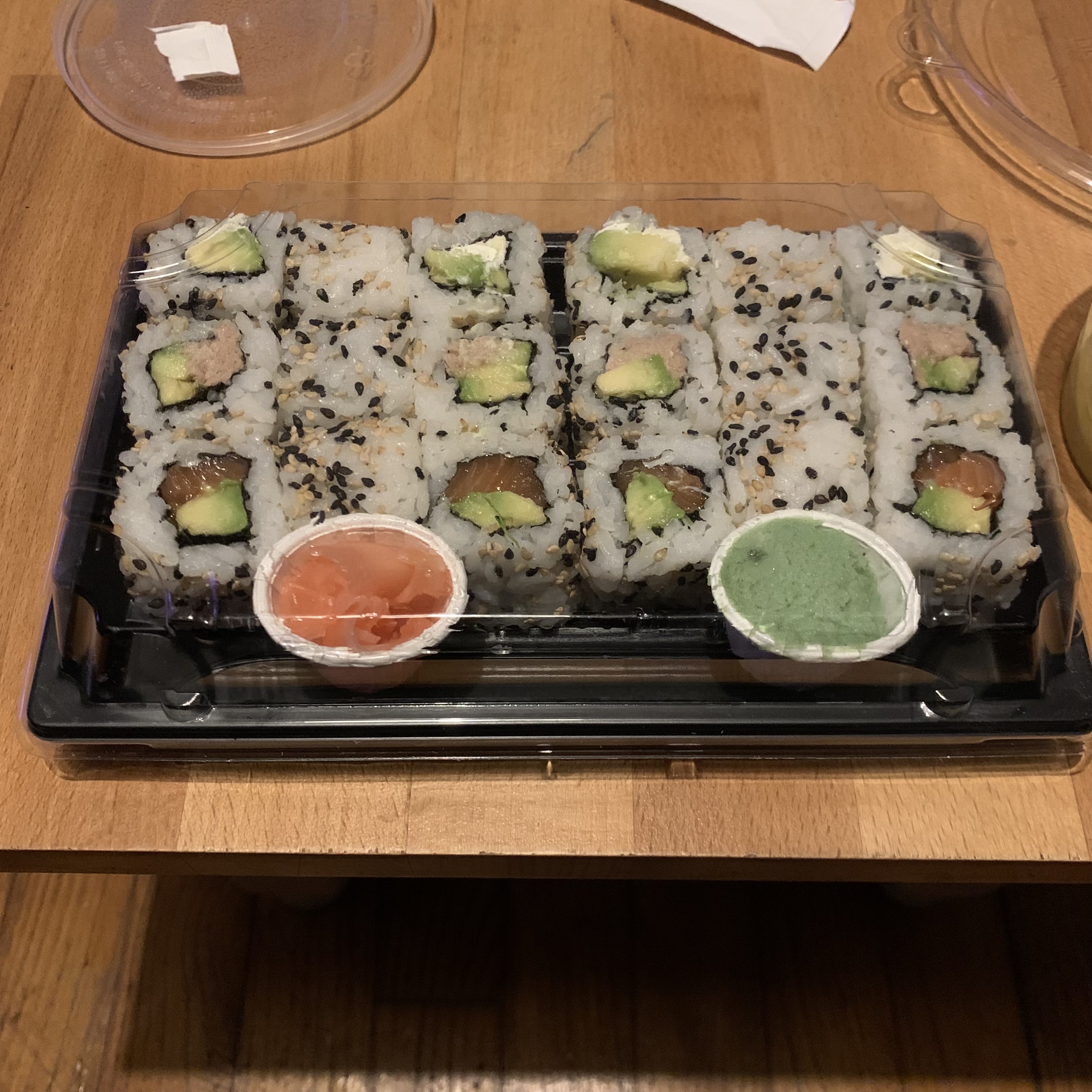Les sushis n'étaient pas mauvais et de belle taille mais je suis déçue par leur aspect pâteux et leur saveur. J'ai testé énormément de sushis dans ma vie et si le riz doit en effet être gluant pour que les grains collent, on doit pouvoir encore en apercevoir la forme, ceux-ci ne doivent pas être écrasés comme ce fut le cas pour moi, ce qui a ôté tout le goût parfumé du riz. Quel dommage :(