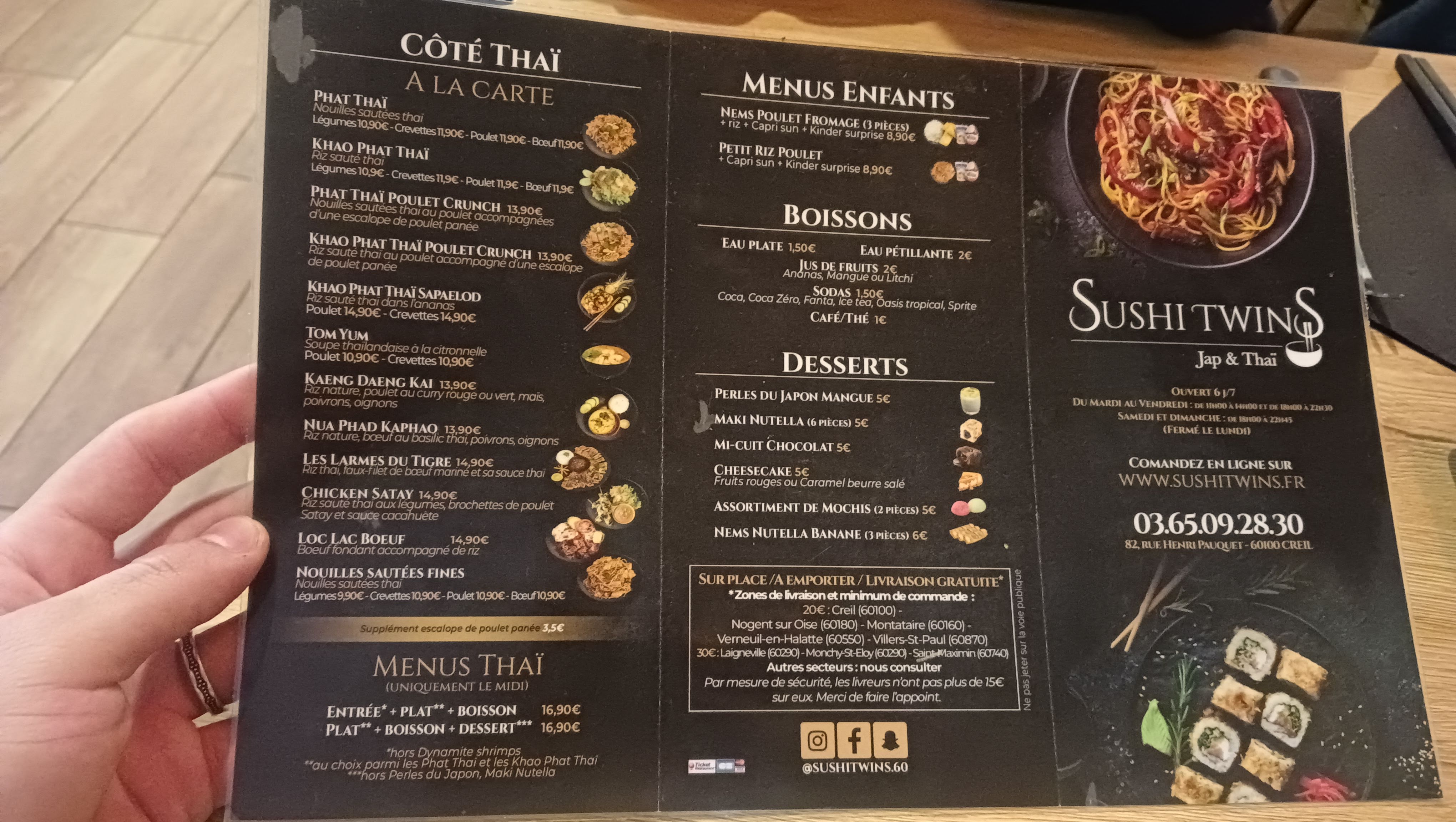 Découvert deja il y a qq annees,ce restaurant vaut le detour. Les plats sont tres très bons et tres copieux notamment les pad thaï. Les makis et les nems sont egalement tres bons. Vous pouvez passer commande par telephone puis aller la recuperer ou manger sur place mais il faudra reserver car la salle dispose de peu de couverts. Je recommande très vivement ce restaurant.