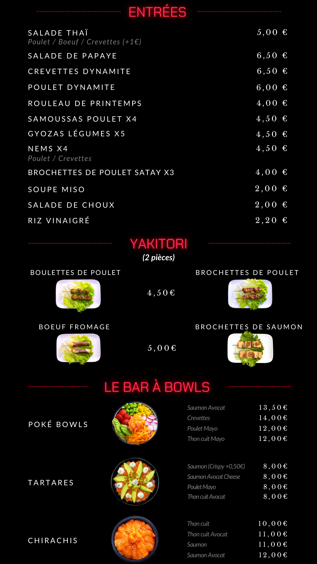 Posté le 22/12/2024 à 02:17"Mais quel DÉCEPTION !!!!! 2025 nous avons commandé plusieurs menu en famille Les shoushi sans goût plus de riz pas cuit que de saumon fromage avocats aucun Les pates thai crevette 🍤 un bloqué gluant aucun assainement Le serveur durant la commandé téléphone aucun professionnalisme Restaurant à fuir"