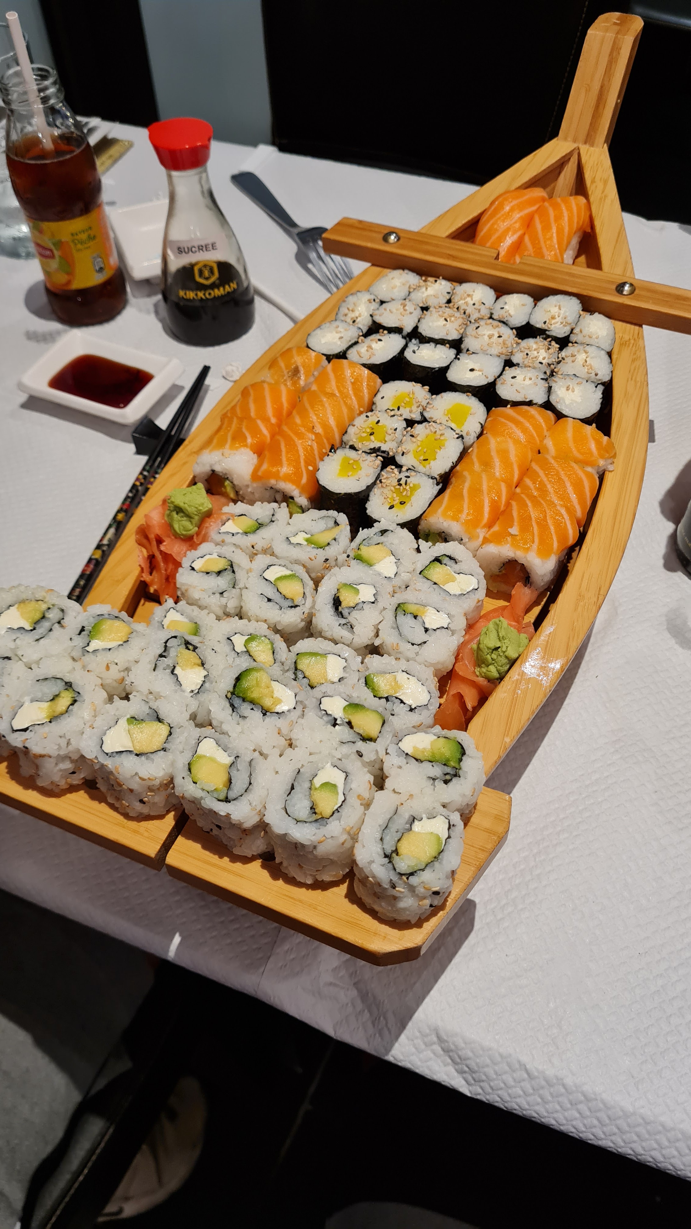 Nous etions 3, arrivés à 12h50 et on avait une seance ciné à 14h, à 13h42, nos sushis n étaient toujours pas sur notre table. On.a décidé donc de partir. Il n y avait qu une personne dédiée à la fabrication des sushis. Comment peut on mettre qu une seule personne alors que plus de 80% des commandes concernent les sushis.