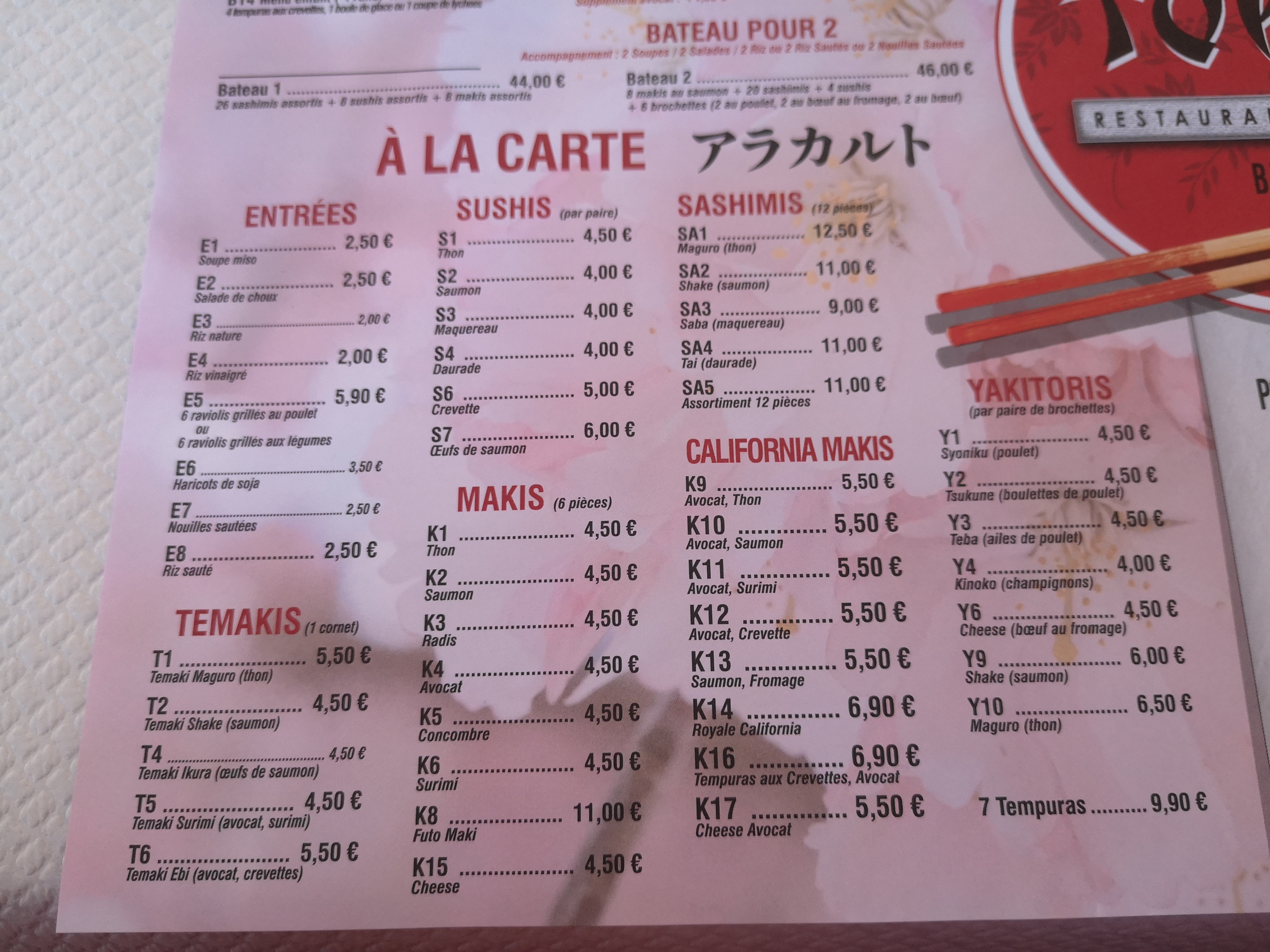 Depuis le temps que j’y passais avec ma famille ce restaurant me donnait envie avec sa carte en vitrine qui tape à l’oeil. Ce soir le 15/07/19 pour fêté un évènement j’ai décidé d’y invite ma famille. Nous avons pris un cocktail sans alcool qui était bon mais rien de dur à faire ensuite on a pris un assortiment de sushi, j’ai trouvé la qualité n’avais rien à voir avec le prix (qualité médiocre), la sauce des sushi sucré n’était pas bonne car un gout .... ensuite le saumon des sushi de mauvaise qualité. Ensuite des mouches, moucherons dans le restaurant ( insupportable pour moi), les serveuses qui se trompent sur la commande, on dirait des débutantes, ensuite nous avons pris des brochettes de st jacques on aurais dit du plastique et sans gout, des brochettes de poulet je n’ai toujours aucune nouvelle du poulet, des gambas secs sans gout, des nouilles et du riz sauté avec aucune saveur, des ravioles qui pour moi sont du congelé réchauffer, des gambas sec et sans gout. Parlons des couverts, de la carafe d’eau plein de tartre !!! Une énorme déception !!!!! UNE CATASTROPHE !!!! Je déconseille FORTEMENT ce pseudo restaurant japonais qui n’a que le nom de japonais !!!!