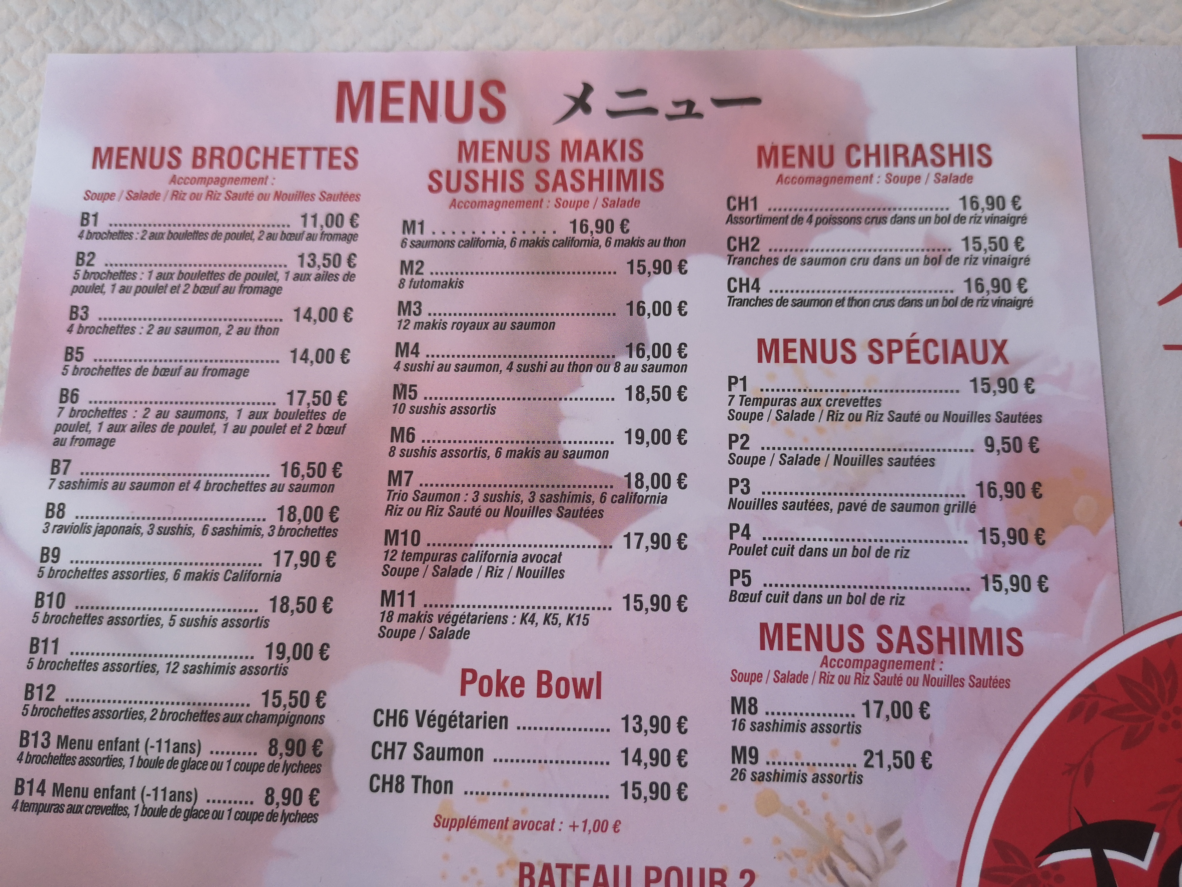 On a manger 4 menus avec comme accompagnement soupe et choux CH1 sashimis de poissons et riz P5 bœuf riz P3 saumon grillé et pattes sautées ( sans plus au niveau gustatif) B3 brochettes de poissons Les plats sont très copieux et bons On a payé 64€ (avec 1 bouteille d'eau gazeuse) Il serait tout de même bon que les serveurs et serveuse gardent leur masque tout le long du service!