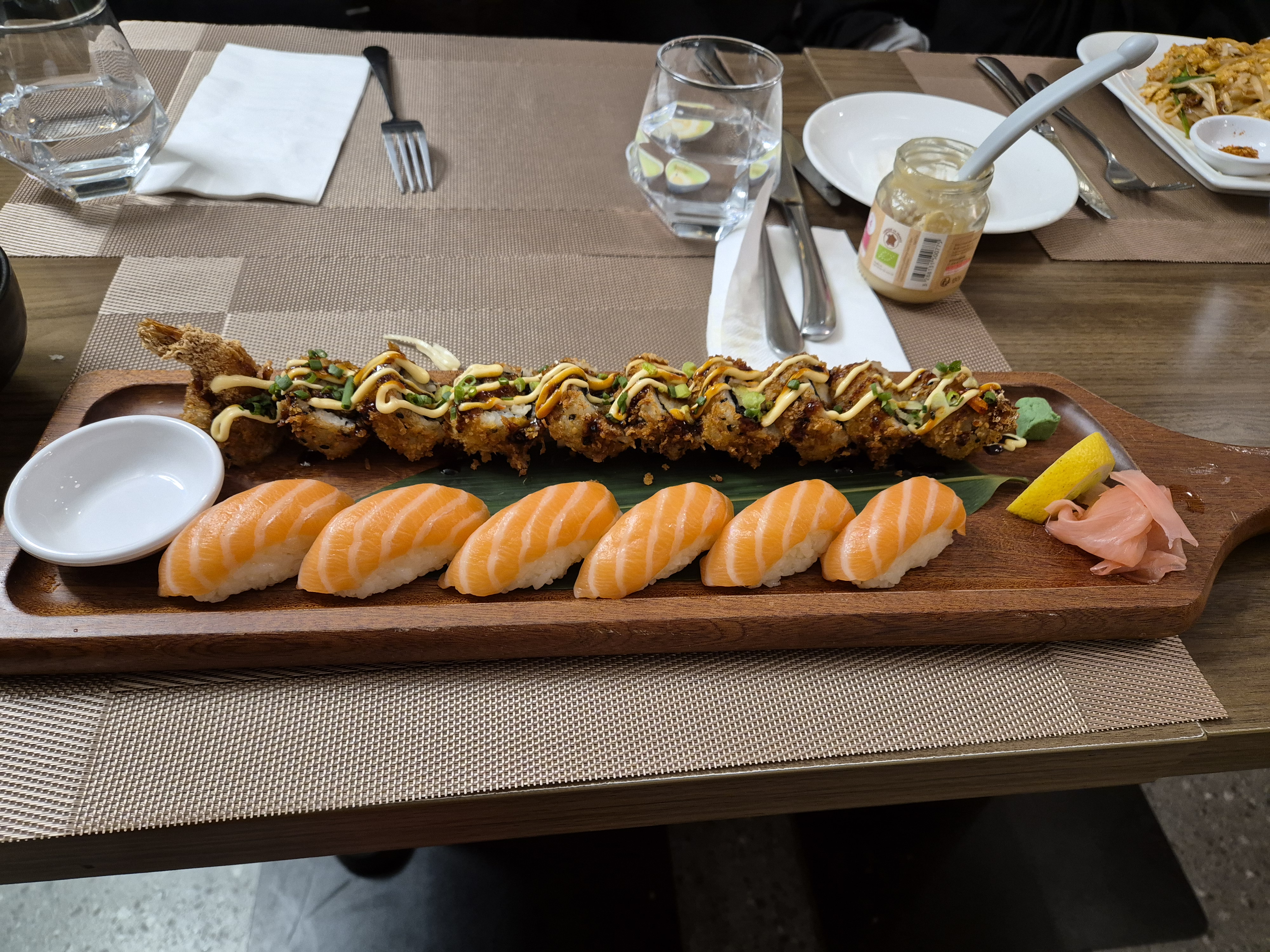 Nous nous sommes arrêtés ici pour dîner en revenant de vacances après une journée dans la circulation et c'était juste l'arrêt parfait. Le personnel était super sympa et les sushis étaient délicieux ! Nous avons également eu un végétarien pad thaï très savoureux. Tout était top et nous recommandons totalement cette adresse !