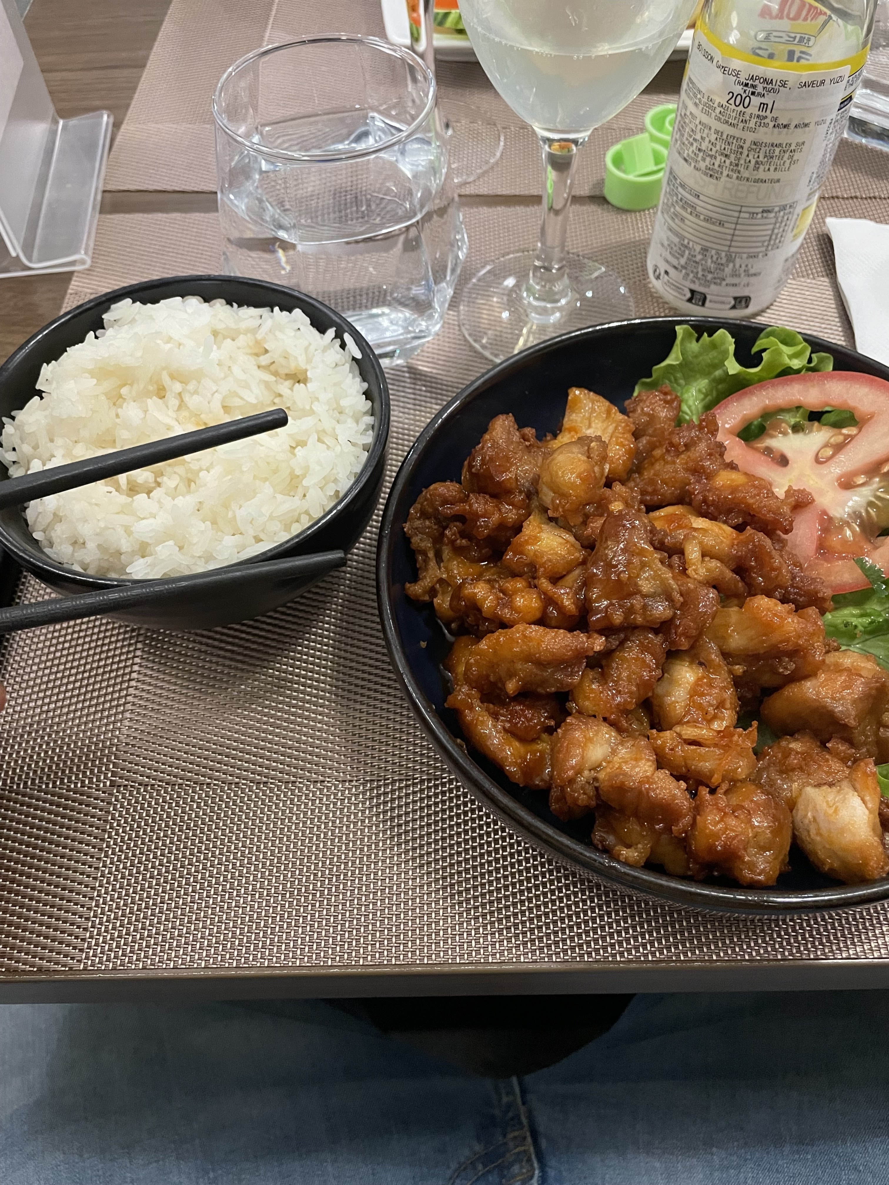 Très bon restaurant qui propose des plats Thaï et Japonais. J'y ai mangé des gyozas, puis poulet croustillant avec riz et mousse chocolat. Les portions sont généreuses et le prix raisonnable. Juste j'aurai préféré une sauce gyoza classique plutôt que la sauce épicée qui était avec , je suis plutôt puriste des gyozas à la japonaise. La salle bien décorée , ambiance calme, le service impeccable . Je recommande !