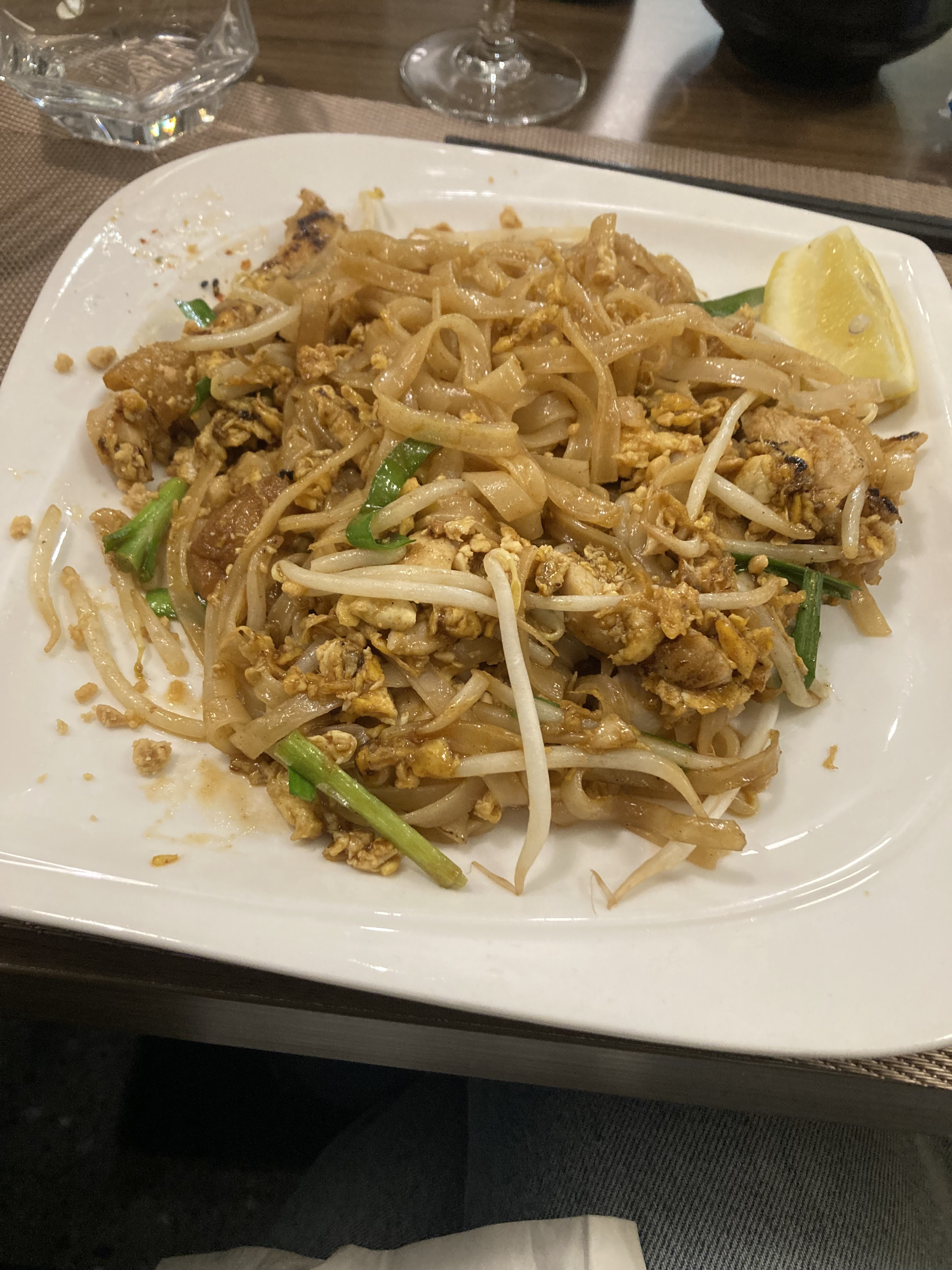 Pad thaï poulet avec plein de cartilages et texture caoutchouteuse, mauvaise odeur et sauce dégoûtante. Une connaissance a eu une intoxication alimentaire de 3 jours après avoir mangé des nems là bas. De gros efforts à faire niveau qualité pour certains plats !