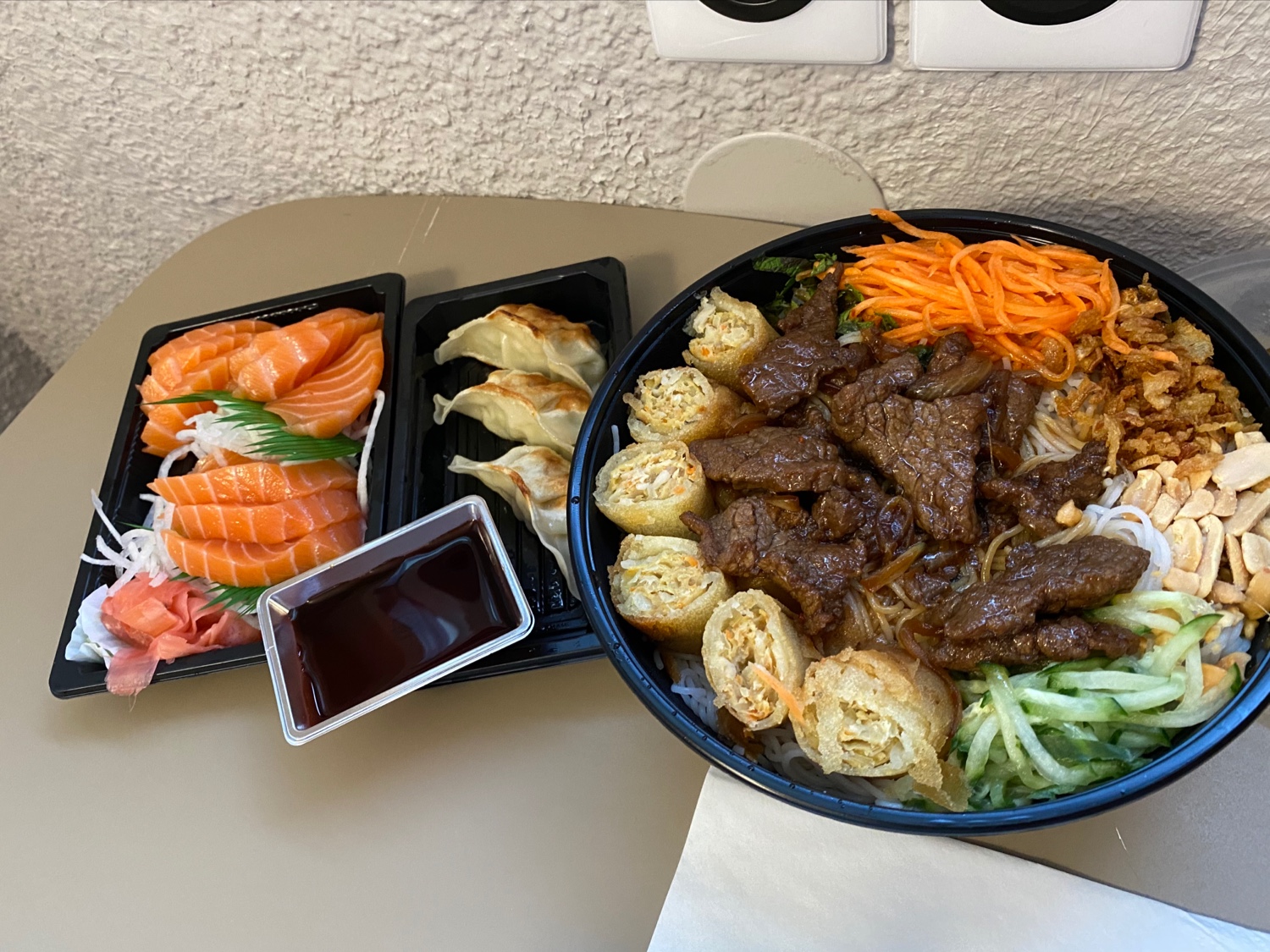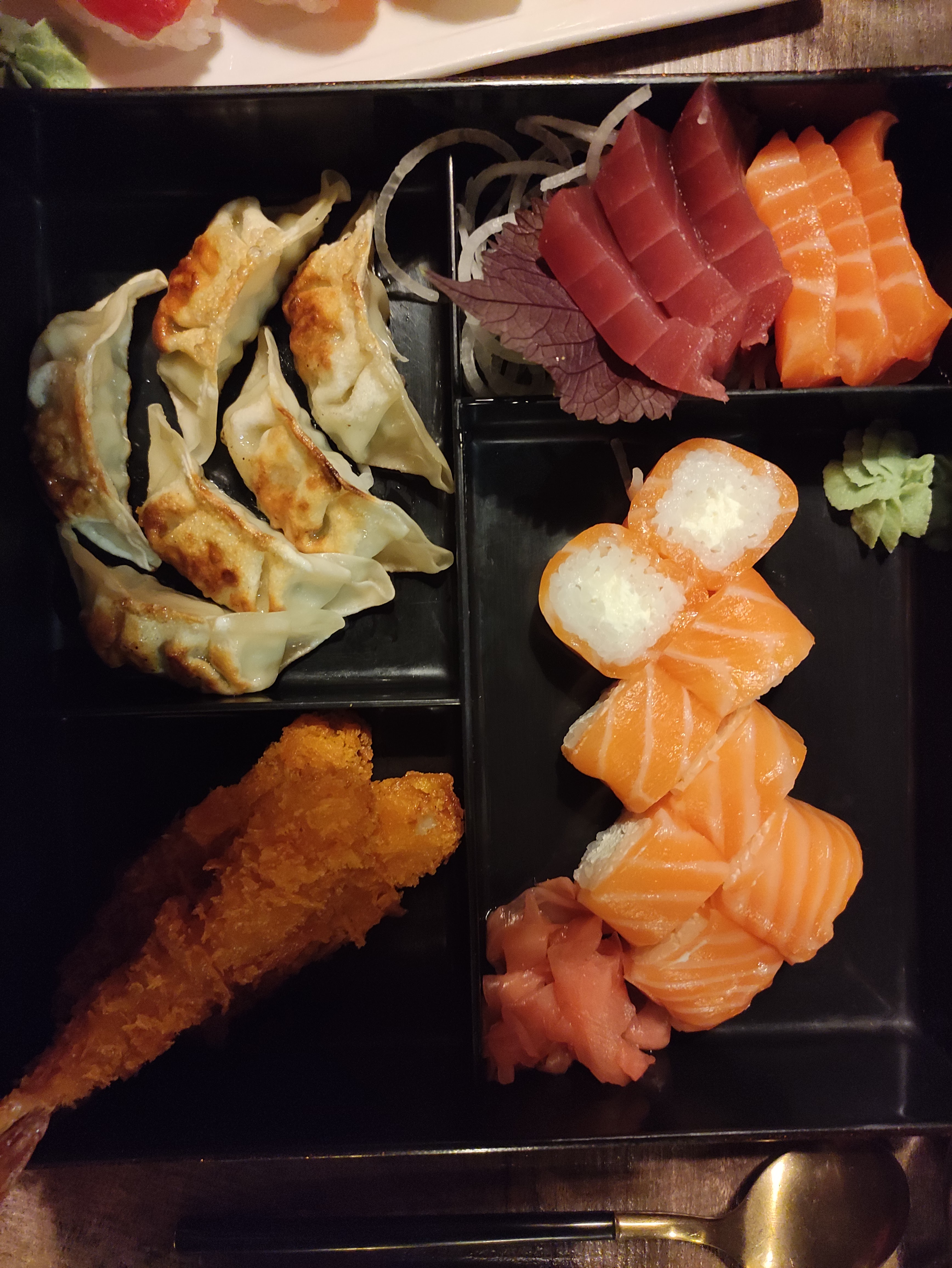 Produits frais, plats copieux. Ici sashimis saumon, Gyozas et boboun bœuf Livraison rapide et soignée via Deliveroo Rien à dire, je recommande
