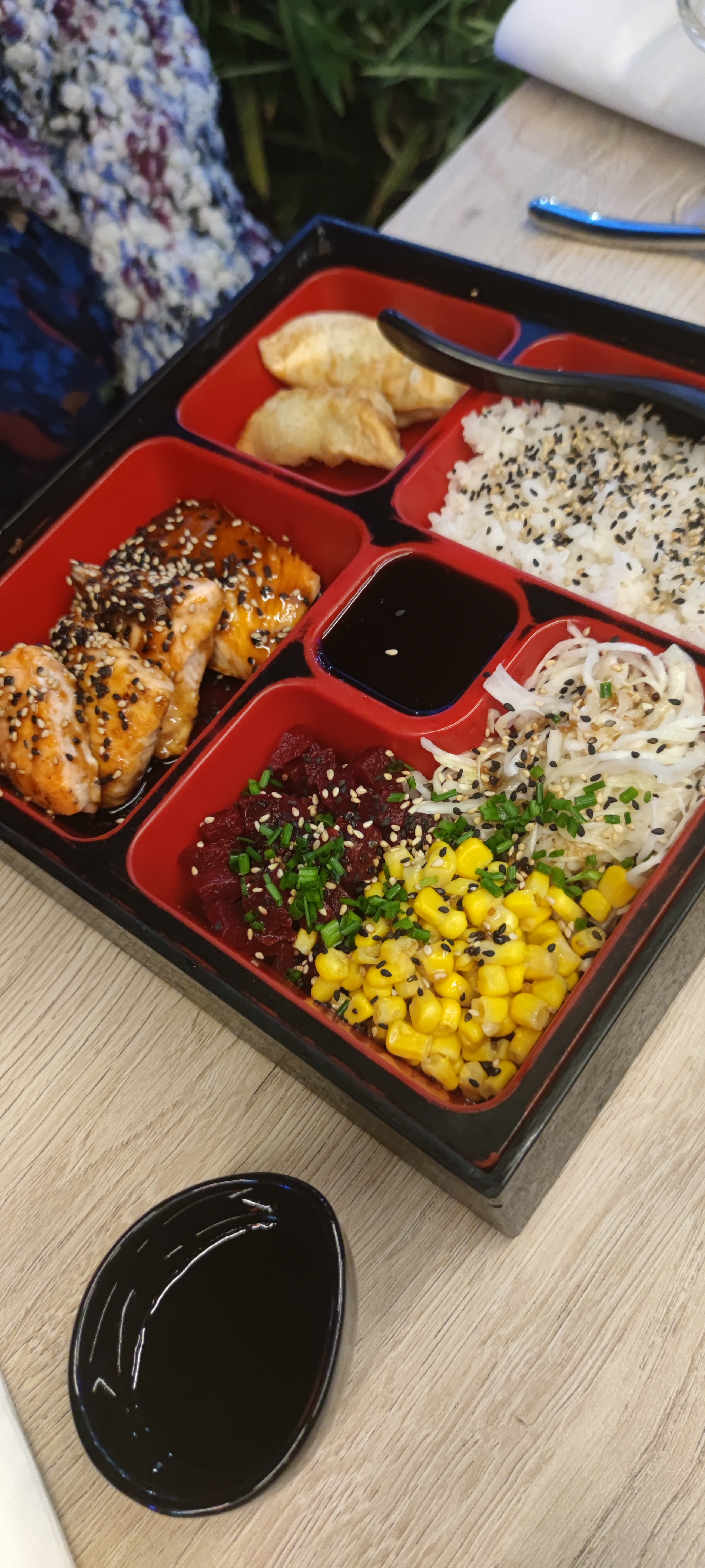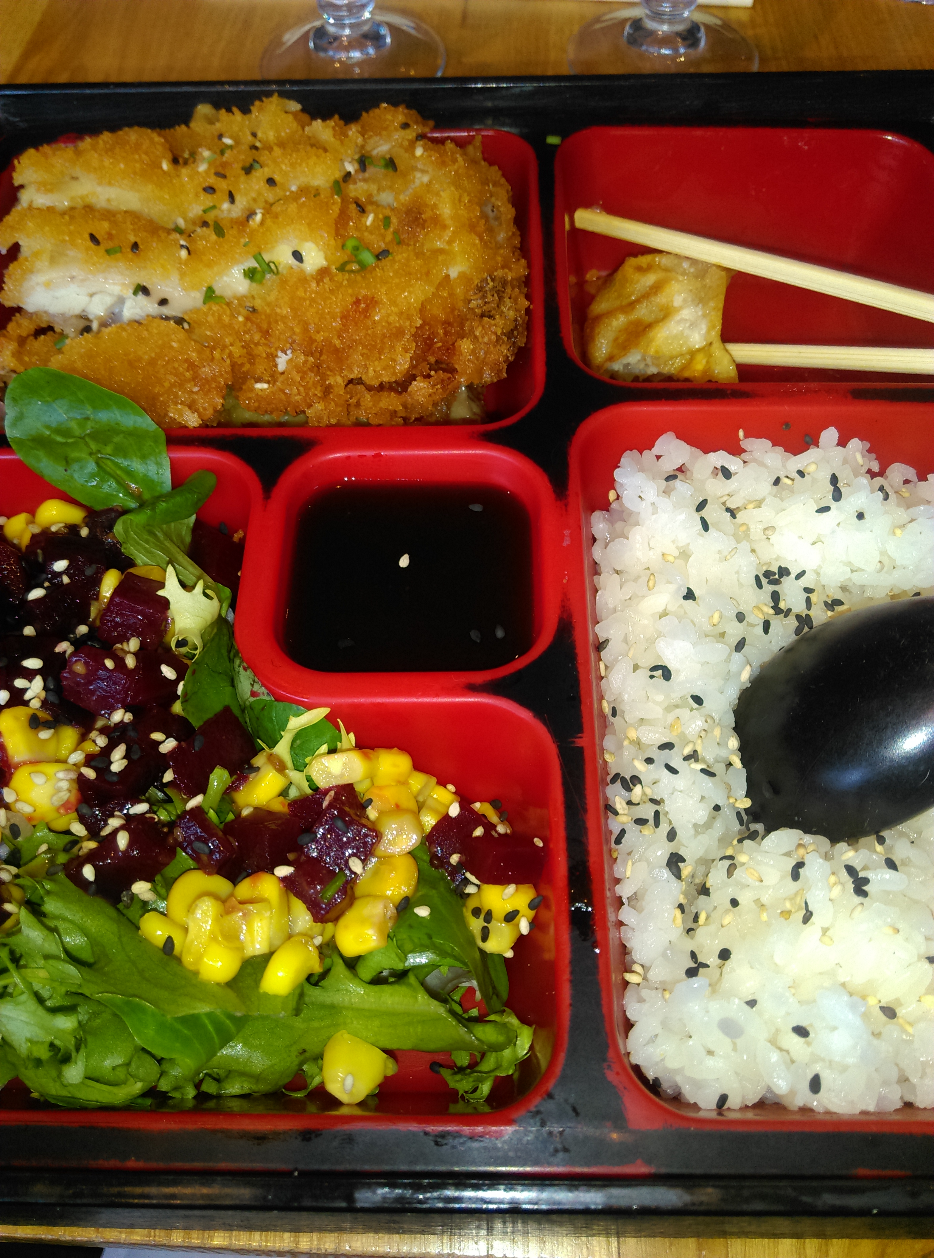Nous avons commandé et sommes venus réceptionner notre commande à l’heure indiquée. Ça s’est très bien passé nous avons eu une serveuse aimable et souriante. De plus nous avons eu des mots sur nos commandes, une jolie attention qui fait plaisir ! Concernant les plats c’était délicieux ! Je pense que ça serait bien de préciser sur la carte ce que contient le bento a part la viande car je ne m’attendais pas a ce que cela soit aussi copieux et j’ai pris des gyoza en plus !