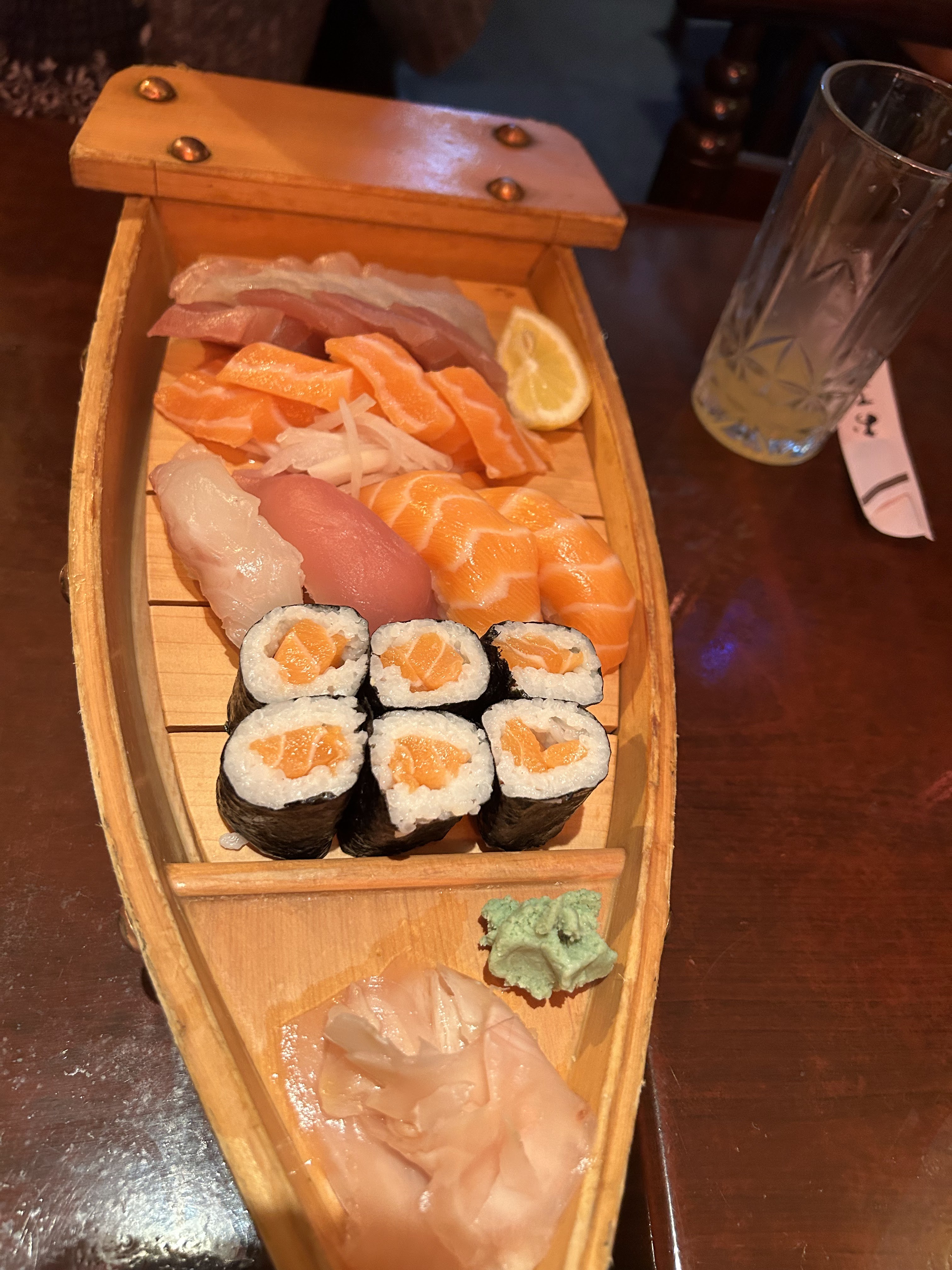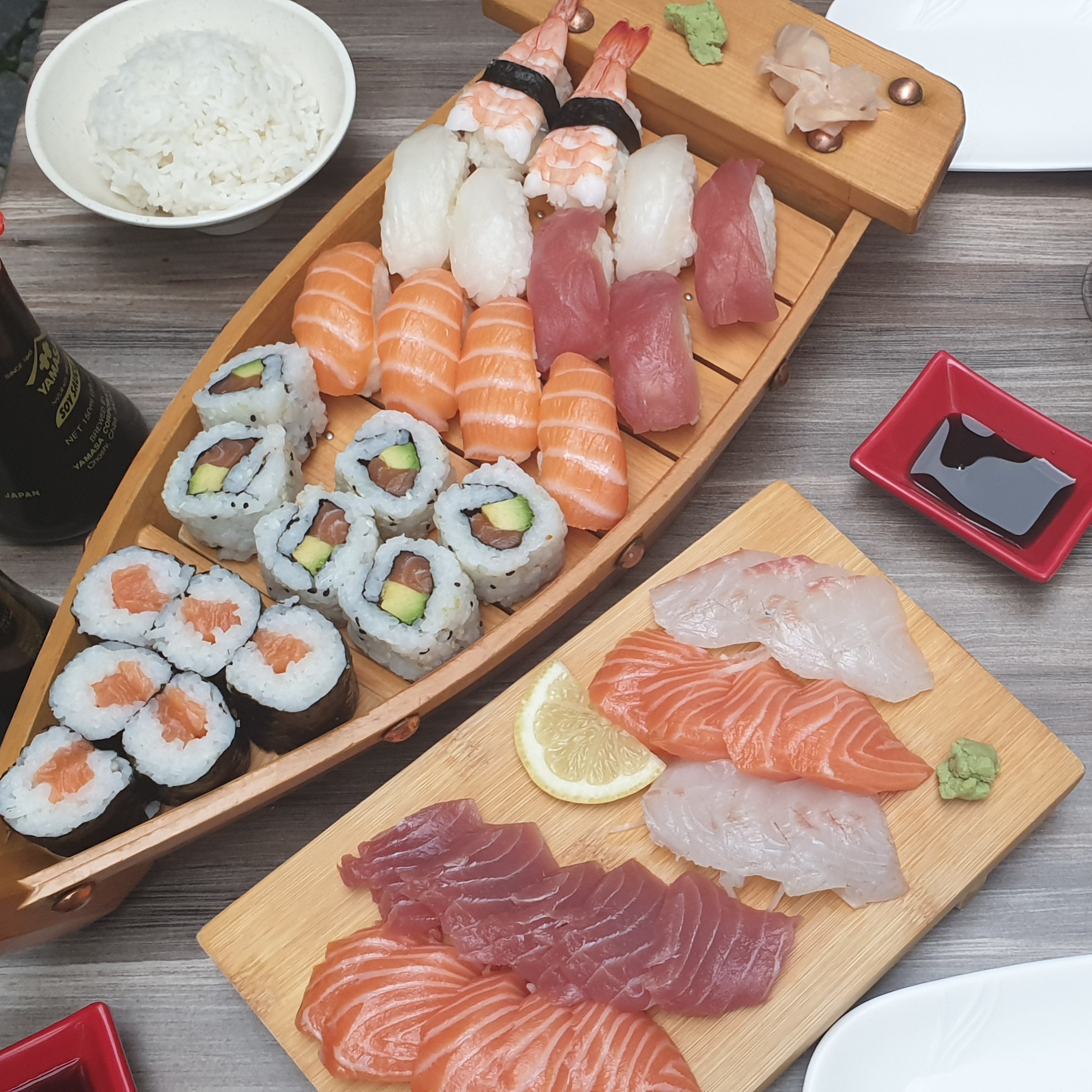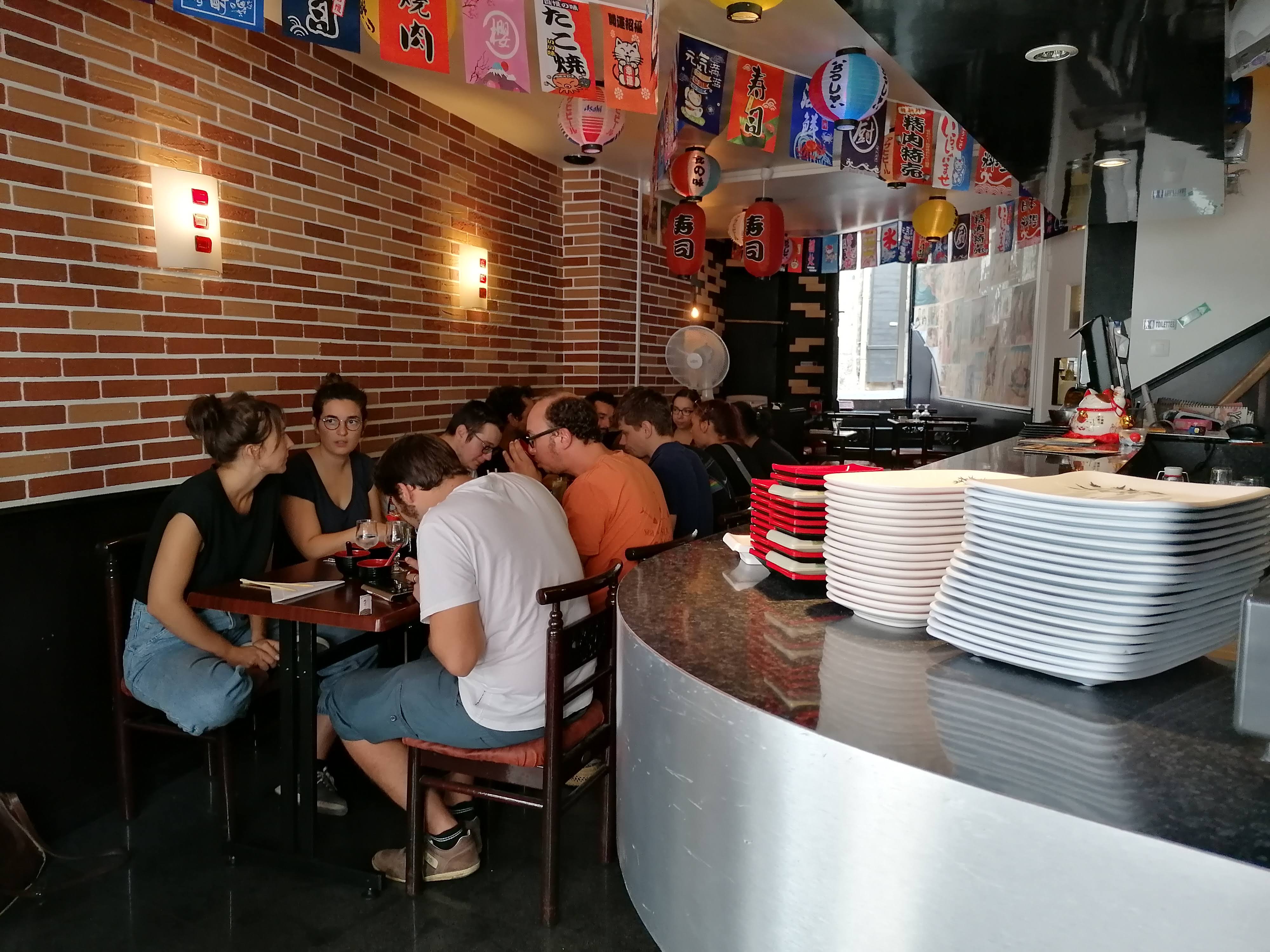 Nous y sommes allé à une douzaine heureusement il y avait de la place. On a pris des bateaux (gros assortiment de sushis, makis et sashimis) et c'était très bon. Le lieux est un peu petit par contre.