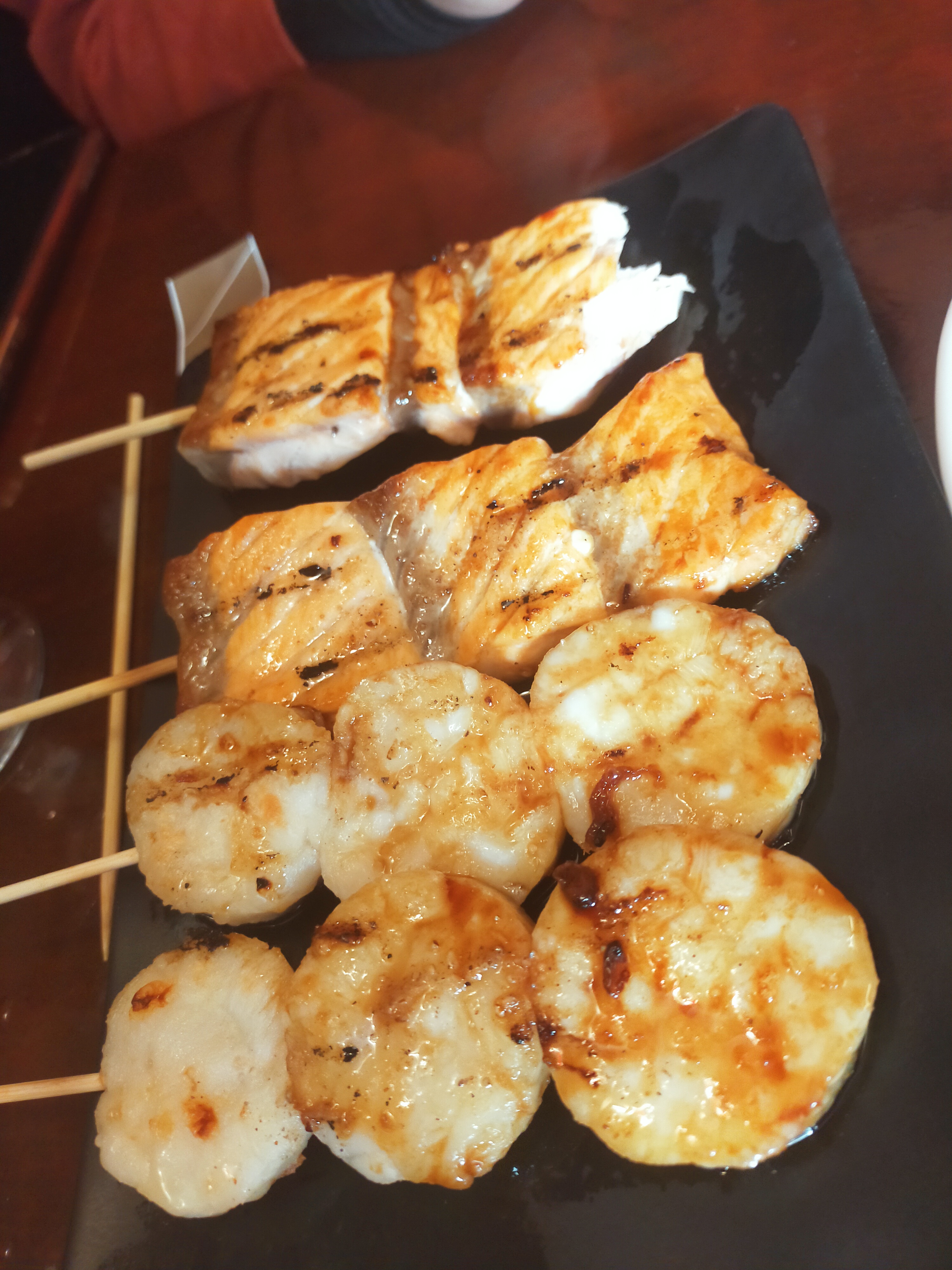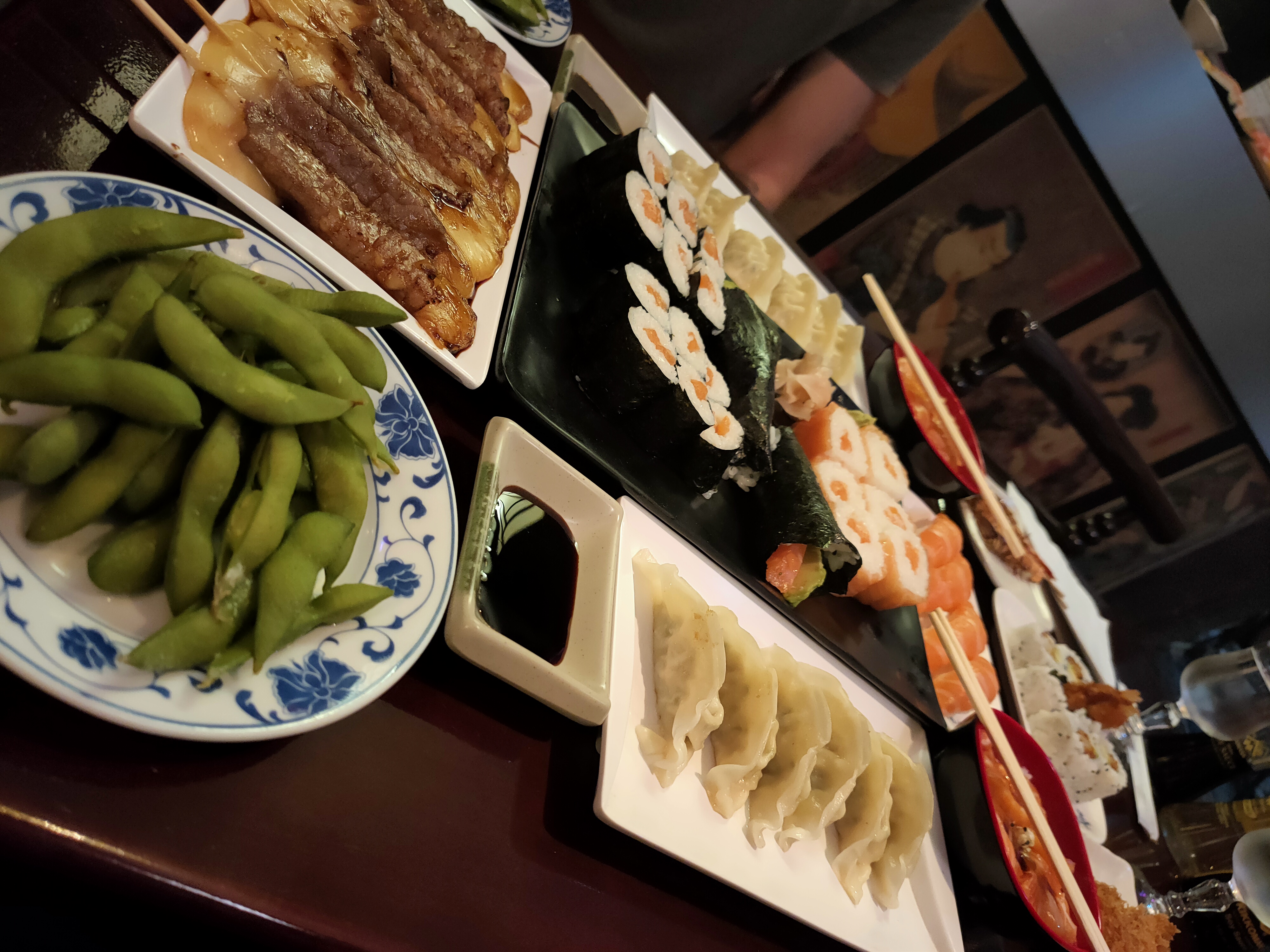 Restaurant japonais, personnel peu ouvert à la discussion. Plat de brochette, sushis, makis et autre sashimis...